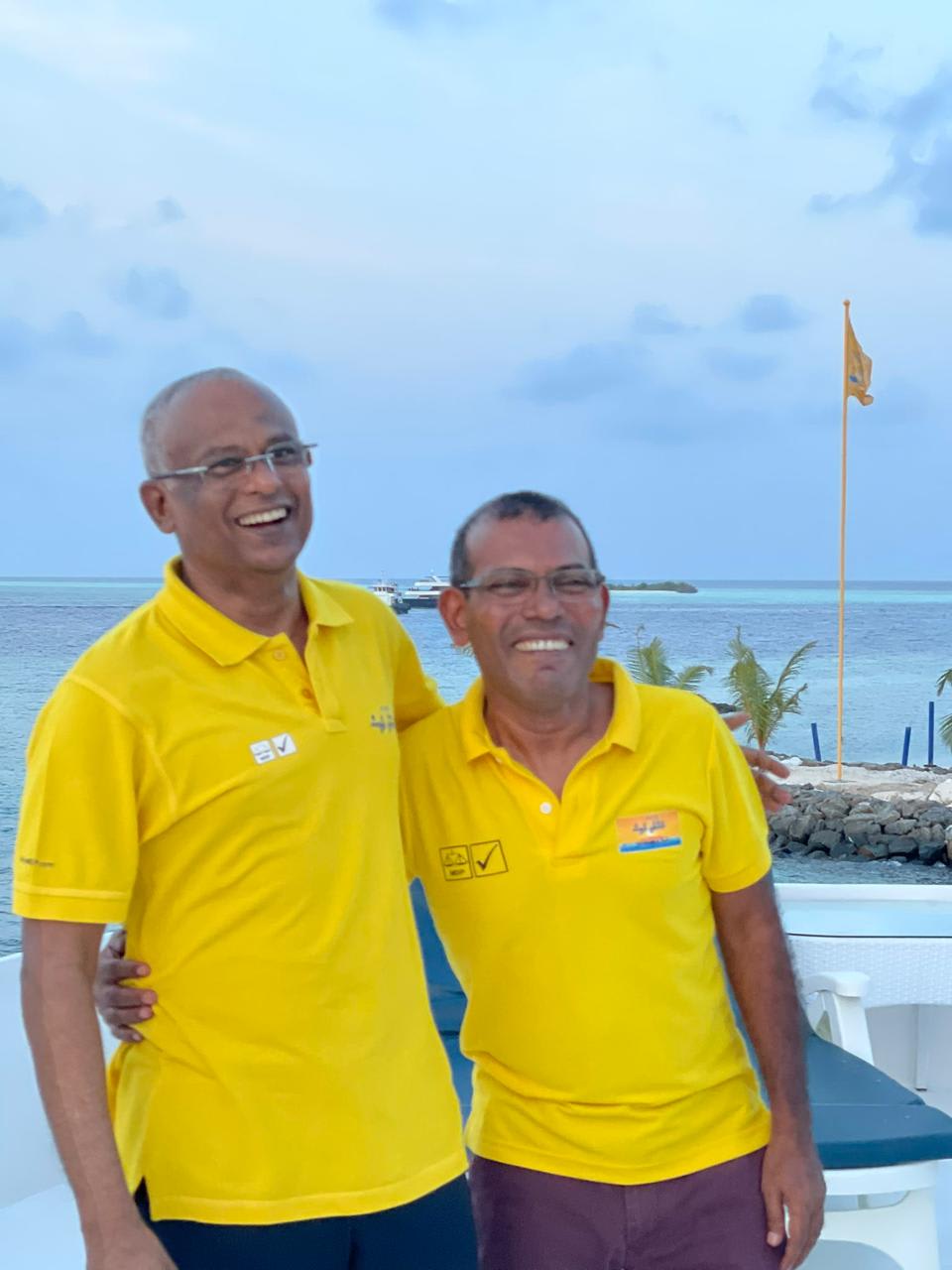 އެމްޑީޕީގެ ކެމްޕޭން ނިންމުމުގެ ޖަލްސާގައި ރައީސް ސޯލިހް އާއި ނަޝީދު: ޕާޓީގެ ކޯޅުން މި އިންތިހާބަށް އަސަރުކުރި. -- ފޮޓޯ / އެމްޑީޕީ