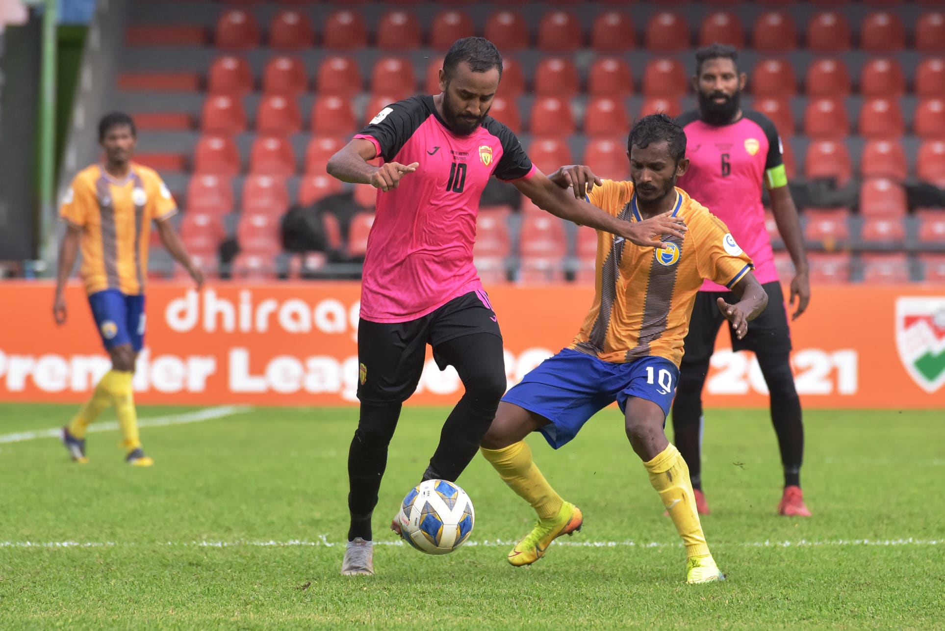 ލީގުގެ މެޗެއްގެ ތެރެއިން އީސަ (މ) ޓީސީގެ ދެ ކުޅުންތެރިން ކައިިރިން ބޯޅަ ފޮނުވާލަނީ.-- ފޮޓޯ: އިބްރާހިމް ފާއިދު/ އެފްއޭއެމް