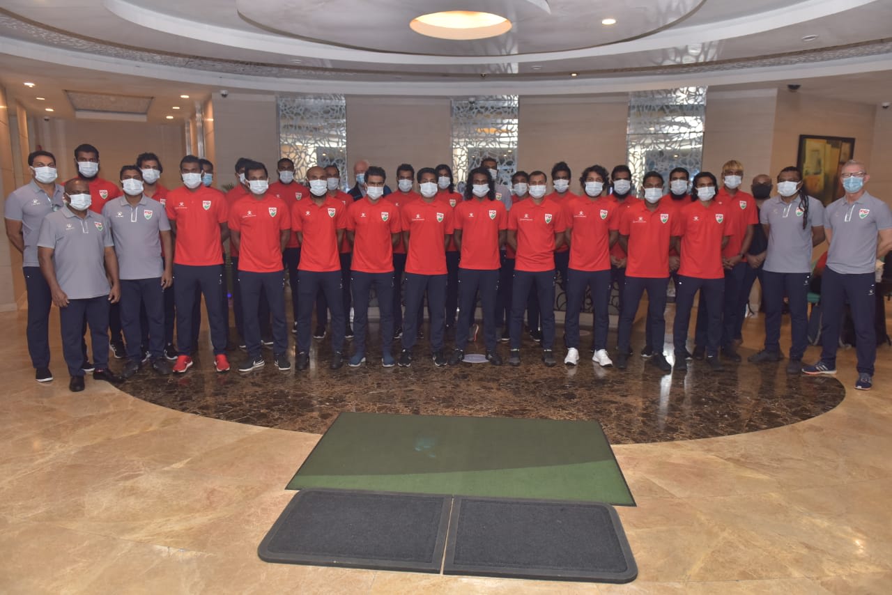 ދުބާއީ އަށް ފުރަން ދިއުމުގެ ކުރިން ގައުމީ ޓީމުގެ ކުޅުންތެރިންނާއި އޮފިޝަލުން ފޮޓޯ އަކަށް ހުއްޓިގެން.-- ފޮޓޯ: އިބްރާހިމް ފާއިދު/ އެފްއޭއެމް