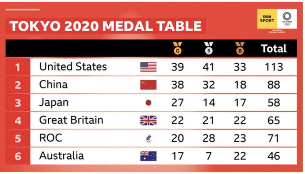 ޓޯކިޔޯ އޮލިމްޕިކްސްގެ މެޑަލް ތާވަލު.-- ގްރެފިކްސް: ބީބީސީ