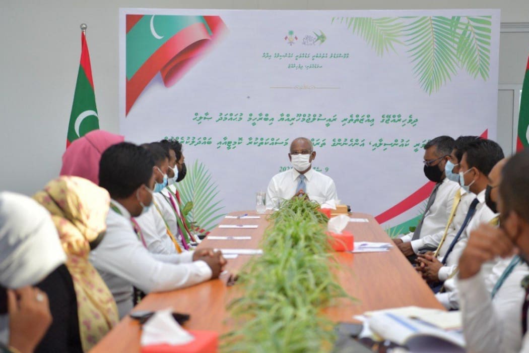 ރައީސް އިބްރާހިމް މުހައްމަދު ސޯލިހް މަޑުއްވަރީ ކައުންސިލްގެ މެމްބަރުންނާ މިއަދު ބައްދަލުކުރައްވަނީ: އެ އަތޮޅު އަލިފުށީގައި އަޅަން ސަރުކާރުން ނިންމި އެއާޕޯޓުގެ މައްސަލަ ވަނީ ބޮޑުވެފައި .-- ފޮޓޯ: ރައީސް އޮފީސް