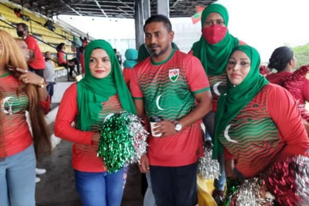 ިމިނިސްޓަރު މަހުލޫފް ރޭސްކޯސް ސްޓޭޑިއަމްގައި ދިވެހި ސަޕޯޓަރުންނާ ބައްދަލުކުރައްވަނީ.-- ފޮޓޯ: ކޮލަމްބޯ އިން ދިވެހިންގެ ފޯރި/ ފޭސްބުކް