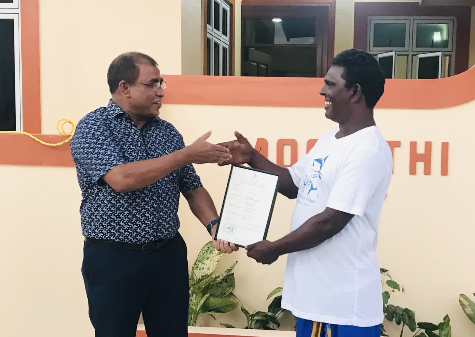 މޫރިތި ގޭގެ ވެރިޔާ މުހައްމަދު އަހުމަދު (ކ) އަށް ޓޫރިޒަމް މިނިސްޓަރު ޑރ. އަބްދުއްﷲ މައުސޫމް މިއަދު ހޯމްސްޓޭ ލައިސަންސް ހަވާލުކުރައްވަނީ