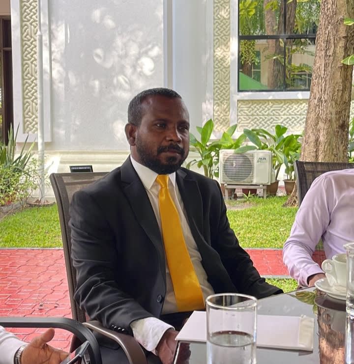 ރާޝިދު ހުވާ ކުރެއްވުމަށްފަހު މަޖިލީހުގެ ގޯތި ތެރޭގައި މެމްބަރުން ތިއްބަވާ ކުޑަ ކައިރީގައި: މިއީ ރާޝިދު މަޖިލީހަށް ނިކުމެވަޑައިގަންނަވާ ފުރަތަމަ ދުވަސް -- ފޮޓޯ: