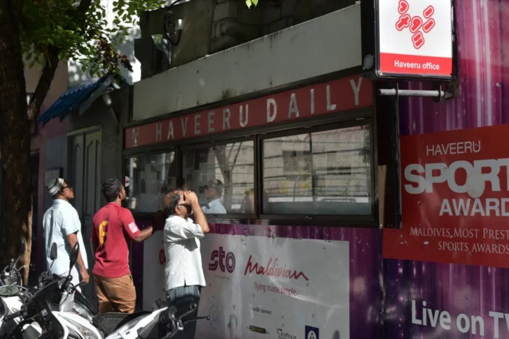 ހަވީރު ނޫހުގެ އޮފީސް ބޭރު؛ އެ ނޫހަކީ ރާއްޖޭގައި އެންމެ ގިނަ ދުވަސްވަންދެން ނެރުނު ނޫސް. ފޮޓޯ: ހަވީރު.