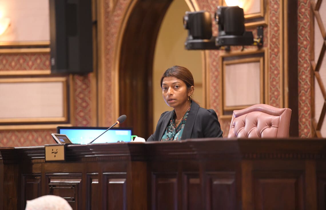 ރައްޔިތުންގެ މަޖިލީހުގެ ނައިބު ރައީސް އީވާ އަބްދުﷲ މަޖިލީހުގެ މިއަދުގެ ޖަލްސާގައި ވާހަކަ ދައްކަވަނީ. އެމްޑީޕީގެ މެމްބަރަކު އޭނާއަށް ފާޑުވިދާޅުވުމުން އޭނާ ރައްދު ދެއްވި. ފޮޓޯ: މަޖިލީހުގެ އިދާރާ