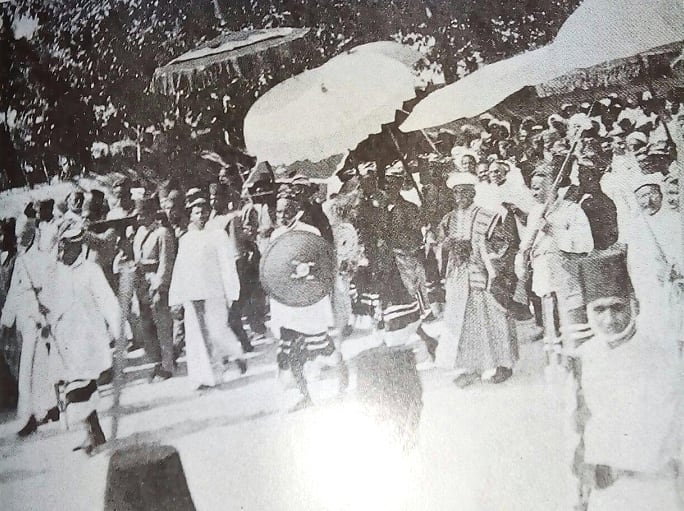 "ރޯދަމަސް ހުސްވުމުން ވަޒީރު އަހަންނަށް ހެދުމެއް ފޮނުއްވި އެވެ. ދެން އަހަރުމެން އީދު ނަމާދަށް ދާން ނިކުމެއްޖައީމެވެ. ވަޒީރު ވަޑައިގަންނަވާ މަގު އޮތީ ހުދުފޮތި ފަތުރާ މަގުގެ ދެފަރާތުގައި ބޮލި ކޯއްޓޭތައް ޖަހާފައެވެ. އެމަގުގައި އަމީރެއް ވަޒީރެއްގެ ގެޔެއް ހުރިނަމަ އެގެޔެއްގެ ކައިރީގައި ކުދި ދިވެހިރުކާއި ފެންފޯއް ރުކާއި ފަތްކެޔޮ ގަސް އިންދާ އެއްގަހުން އަނެއްގަހަށް ވާދަމައި އޭގައި ކުރުނބާ އިހާތައް އެލުވާ ޒީނަތްކޮށްފަ އެވެ. އެއިން ކޮންމެ ގެޔެއްގެ ވެރިޔަކު އެގެޔެއްގެ ދޮރޯށިދޮށުގައި ހުންނަވައިގެން ވަޒީރު ވަޑައިގެން ދޮރޯއްޓާއި އަރާހަމަވެވަޑައިގަތުމުން އެމަނިކުފާނުގެ ފައިންޕުޅު މައްޗަށް ފަށުއި ނުވަތަ ކަފަ ފޭރާމުގެ ފޭއްޔެއް އެއްލުމުން ވަޒީރުގެ ނޯކަރުން އެ ފޭލިތަކާއި މަގުގެ ދެފަރާތުގައި ހުރި ބޮލިތައް ނަގަ އެވެ. އެ މަނިކުފާނު ހިންގަވާފައި ވަޑައިގަތީ ފައިމަގުގަ އެވެ. ތުރު ކުރައްވައިގެން ހުންނެވީ މިސުރު ކެހެރި އަބާ އެކެވެ. އިސްތަށިފުޅުގައި ބޮޑު ފަގުޑިކޮޅެއް އޮތެވެ. އަދި ބާސްކިހިލީން ފޭރާމެއް ތުރުކުރައްވާފައި ވެއެވެ. އިސްތަށިފުޅު މައްޗަށް ހަތަރު ސަތަރި (ހަތްކޮޅު) ނަގާފައި ހުއްޓެވެ. އެމަނިކުފާނު އަރާވަޑައިގެން ހުންނެވީ ފައިވާން ޖޯޑުކޮޅަކަށެވެ. އެނޫން އެންމެން ތިބީ ފައިވާން ނުލާ ހުސްފަޔާއެވެ. ތާޅަފިއްޔާ ދުންމާރި އާއި ބެރުތައް އެމަނިކުފާނު އަރިހުގައިވެ އެވެ. އެމަނިކުފާނުގެ ކުރީ ގައްޔާއި ފަހަތްޕުޅުގައި އަސްކަރުންގެ މީހުން ތިއްބެވެ.