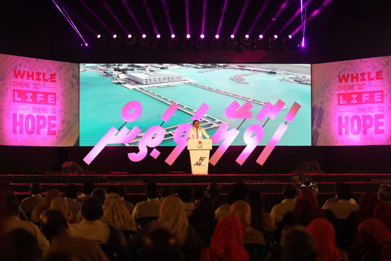 ރައީސް އަބްދުﷲ ޔާމީނަށް ޕީޕީއެމްގެ ރިޔާސީ ޓިކެޓް ދިނުމުގެ ޖަލްސާގައި އެމަނިކުފާނު ވާހަކަ ދައްކަވަނީ - ފޮޓޯ: އަބްދުﷲ އިޔާން | އަދަދު