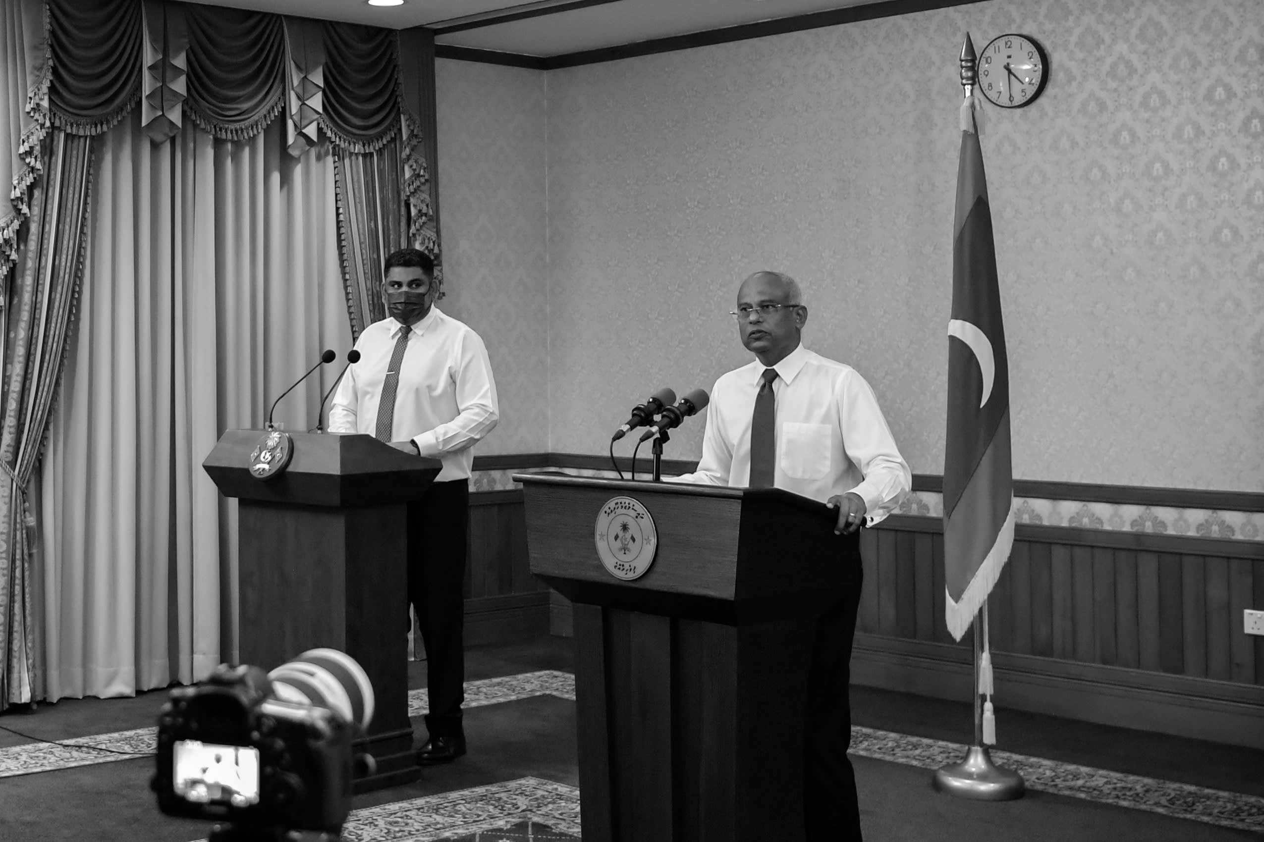 ރައީސް އޮފީހުގައި ބޭއްވި ނޫސްވެރިންގެ ބައްދަލުވުމެއްގައި ރައީސް ސޯލިހާއި މަބްރޫކް. -- ފޮޓޯ: ރައީސް އޮފީސް