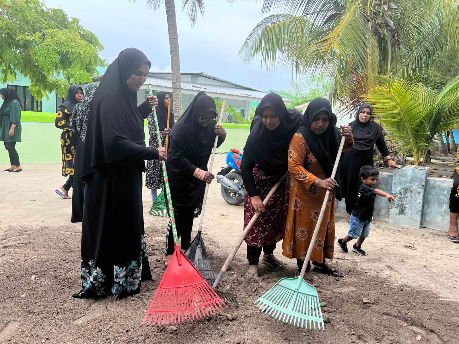ރަށުތެރެ ސާފުކުރުމުގެ މަސައްކަތުގައި ވޭމަންޑޫ އަންހެނުންތަކެއް ހަރަކާތްތެރިވަނީ. -- ފޮޓޯ: ވޭމަންޑޫ ކައުންސިލް