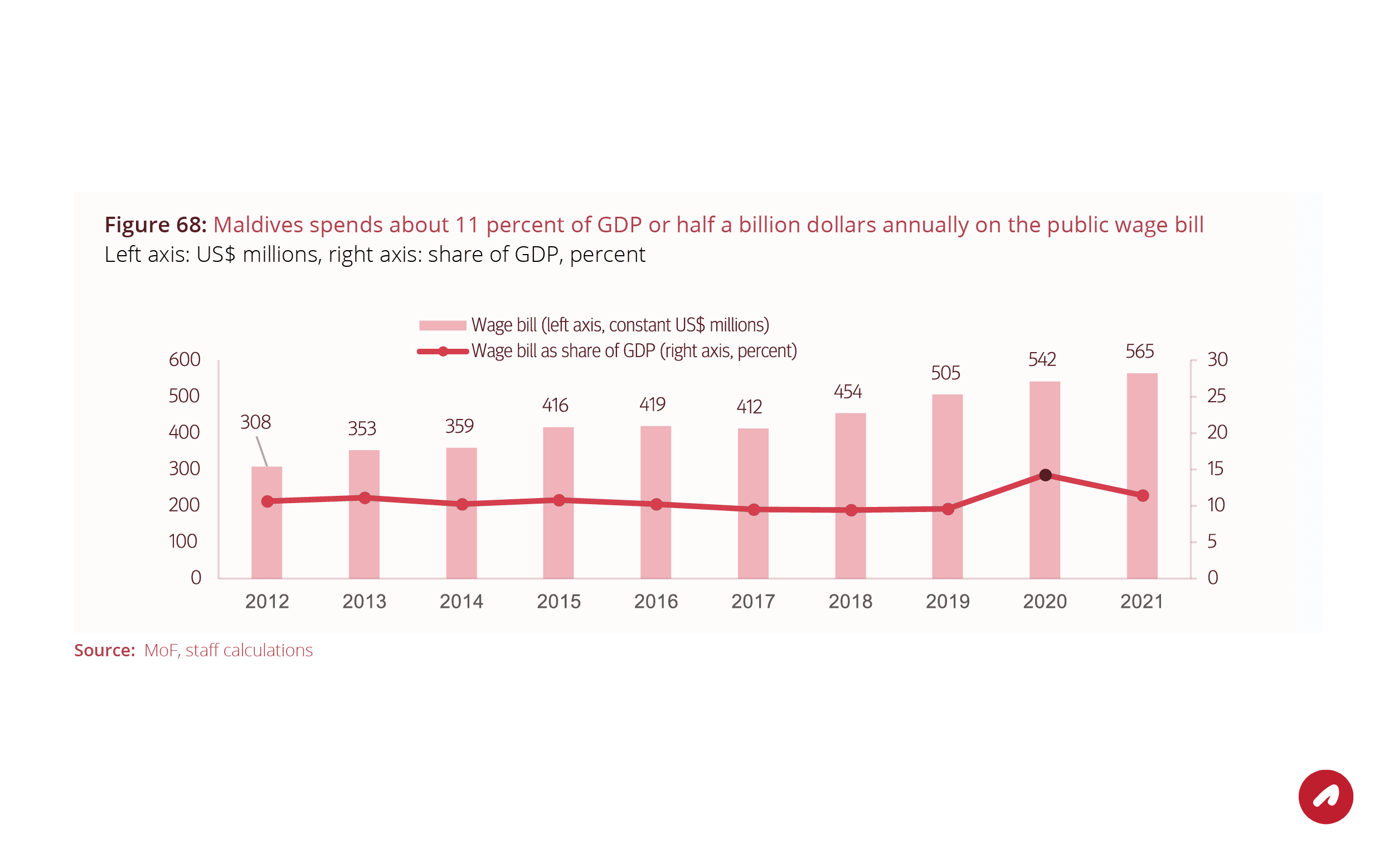 ސަރުކާރުން އާންމުކޮށްފައިވާ ހިސާބުތަކަށް ބަލާއިރު، ފާއިތުވި 10 އަހަރު ދުވަހުގެ ތެރޭގައި، އެކި ސަރުކާރުތަކުން އެވަރެޖުކޮށް އަހަރަކު 433 މިލިއަން ޑޮލަރު (6.68 ބިލިއަން ރުފިޔާ) މުސާރަ އާއި އިނާޔަތްތަކުގެ ގޮތުގައި ވަނީ ހަރަދުވެފަ އެވެ. މިއީ ޖީޑީޕީގެ 11 ޕަސަންޓު އަދި ޖުމްލަ ހަރަދުގެ ތިން ބައި ކުޅަ އެއް ބައި އެވެ. އަދި ފާއިތުވި އަހަރުތަކުގެ ތެރޭގައި އިގުތިސޯދު ކުރިއެރި މިންވަރަށް ވުރެ އިތުރަށް މުސާރަ ދޭން ކުރި ހޭދަ ވަނީ އިތުރުވެފަ އެވެ.