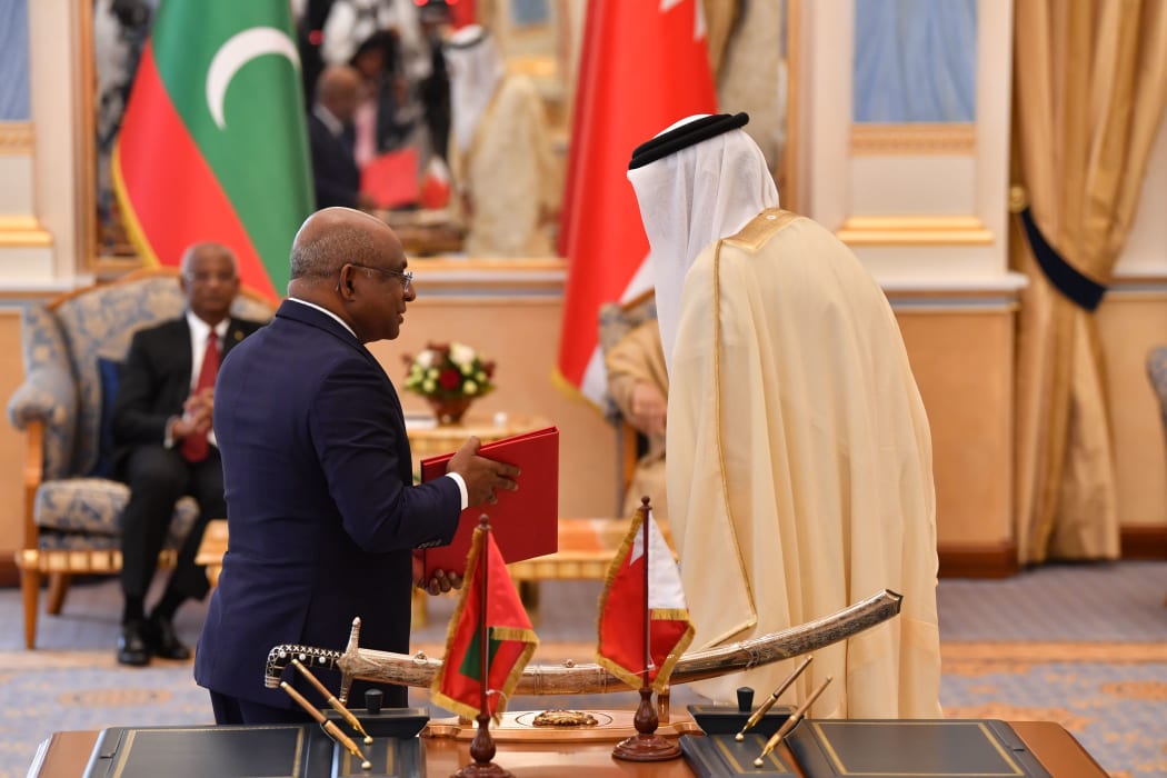 ރައީސް އިބްރާހީމް މުހައްމަދު ސޯލިހް، ބަހްރައިނަށް ކުރެއްވި ރަސްމީ ދަތުރުފުޅުގައި، ދެ ގައުމުގެ ދެމެދުގައި ހާރިޖީ ގުޅުން ބަދަހިކުރުމާބެހޭ އެއްބަސްވުމެއްގައި ރާއްޖޭގެ ފަރާތުން ފޮރިން މިނިސްޓަރު އަބްދުﷲ ޝާހިދު ސޮއި ކުރައްވަނީ. -ފޮޓޯ: ރައީސް އޮފީސް