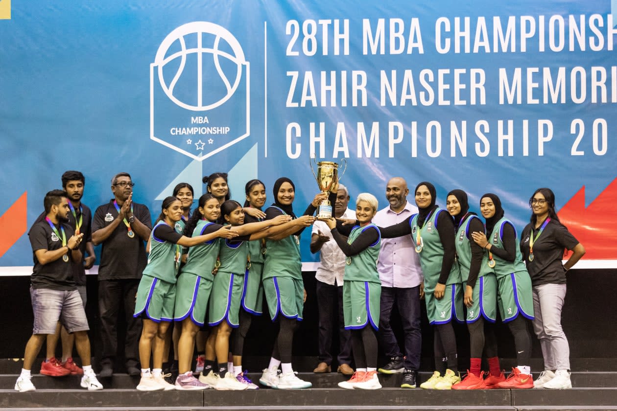 އެމްބީއޭ ޗެމްޕިއަންޝިޕުގެ އަންހެން ބައިގެ ޗެމްޕިއަންކަން ހޯދި ކުއީންސްގެ ކުޅުންތެރިން ޓްރޮފީ އުފުލާލަނީ - ފޮޓޯ: އަބްދުﷲ އިޔާން / އަދަދު