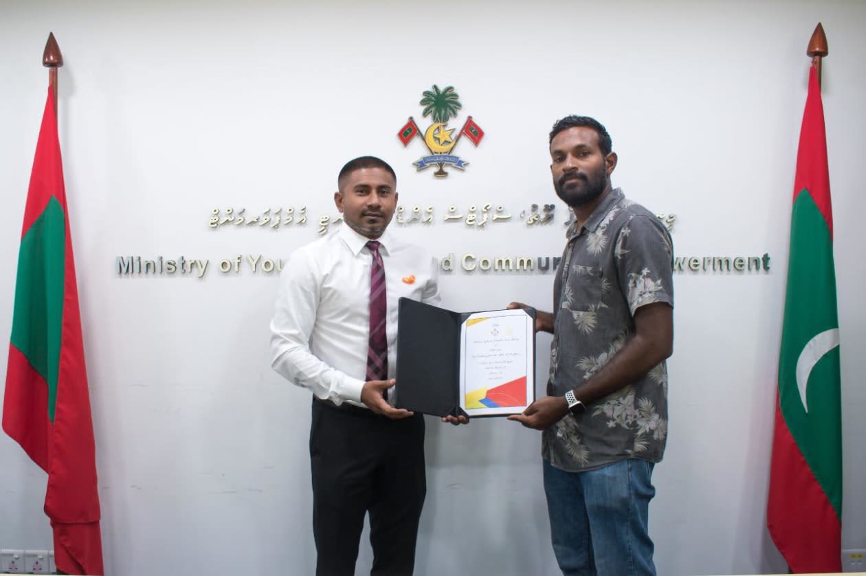 "އަރުތަ" ޕްރޮގްރާމްގައި ސޮއި ކުރުމަށް ފަހު ގައުމީ ބީޗްވޮލީ ޓީމުގެ އެޑަމް (ކ) އާއި ކުޅިވަރާ ބެހޭ ވަޒީރު މަހުލޫފް.-- ފޮޓޯ: ޔޫތު މިނިސްޓްރީ
