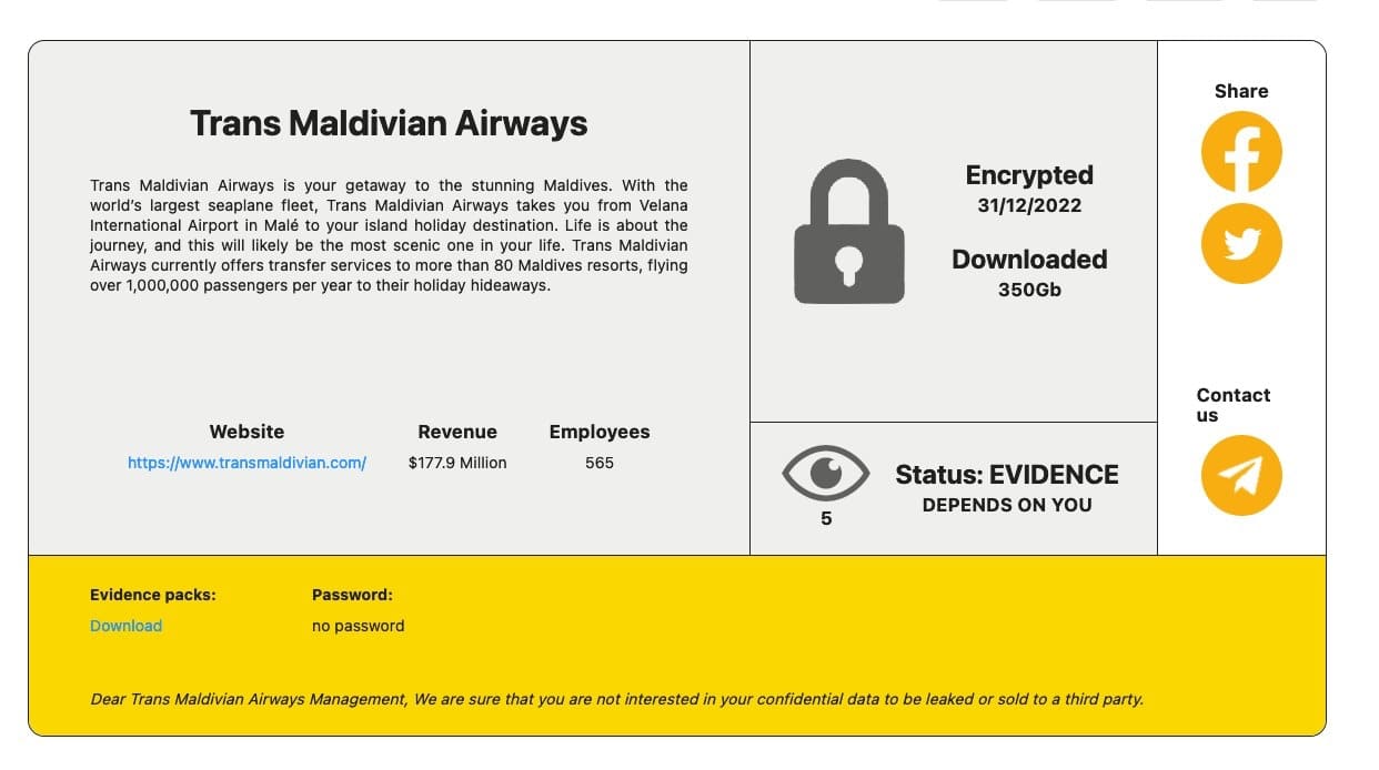 ޓްރާންސް މޯލްޑިވިއަން އެއާވޭސް (ޓީއެމްއޭ) ގެ ސާވާ ހެކްކޮށް ގިނަ އަދަދެއްގެ މައުލޫމާތު ވަގަށް ނަގާފައިވާ ކަމަށް މަޝްހޫރު ހެކަރުންގެ ގްރޫޕް ރެންސަމް ހައުސްއިން ބުނެފި އެވެ.