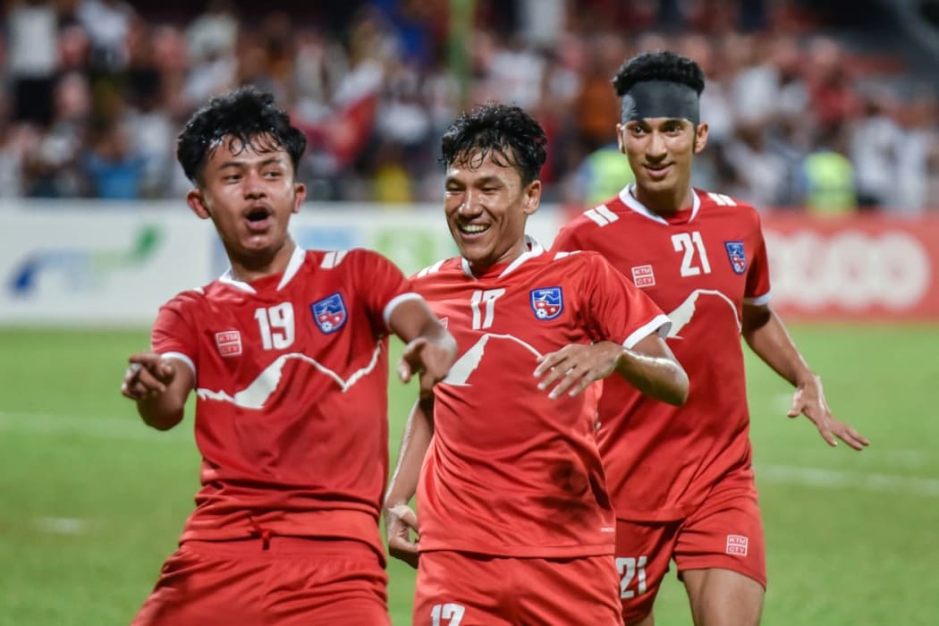 2021 ވަނަ އަހަރުގެ ސާފް ޗެމްޕިއަންޝިޕްގެ މެޗެއްގެ ތެރެއިން ނޭޕާލް ކުޅުންތެރިން ގޯލު ޖެހުމަށް ފަހު އުފާފާޅުކުރަނީ.--- ފޮޓޯ: ހުސެއިން ވަހީދު/ އަދަދު