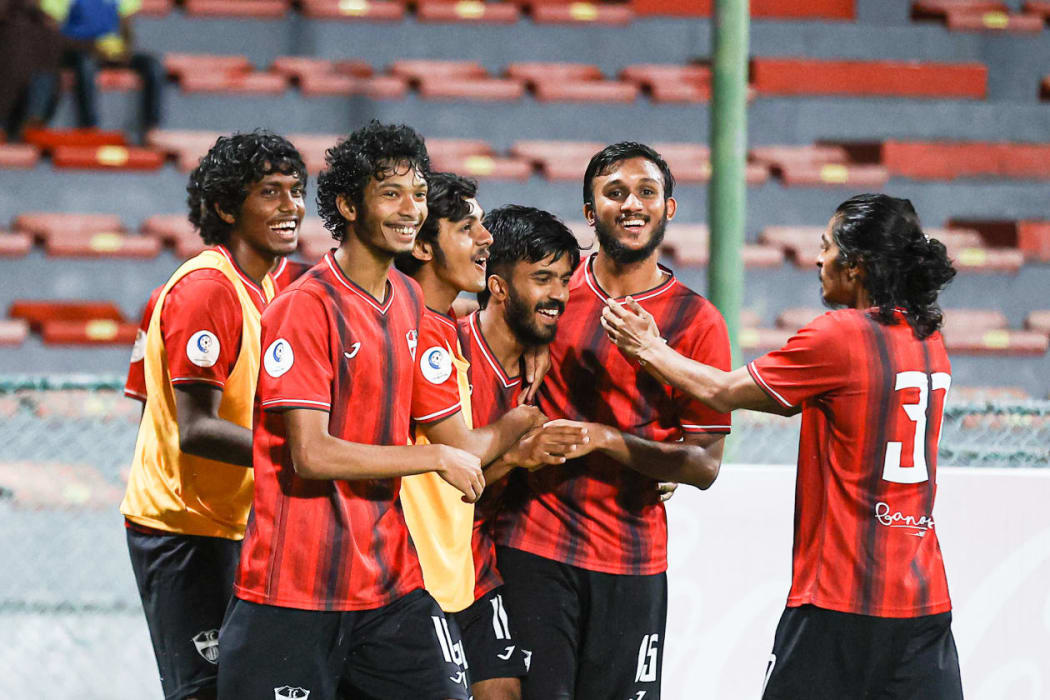 ޓީސީ ކުޅުންތެރިން ގޯލު ޖެހުމަށް ފަހު އުފާފާޅުކުރަނީ.--- ފޮޓޯ: އަދަދު