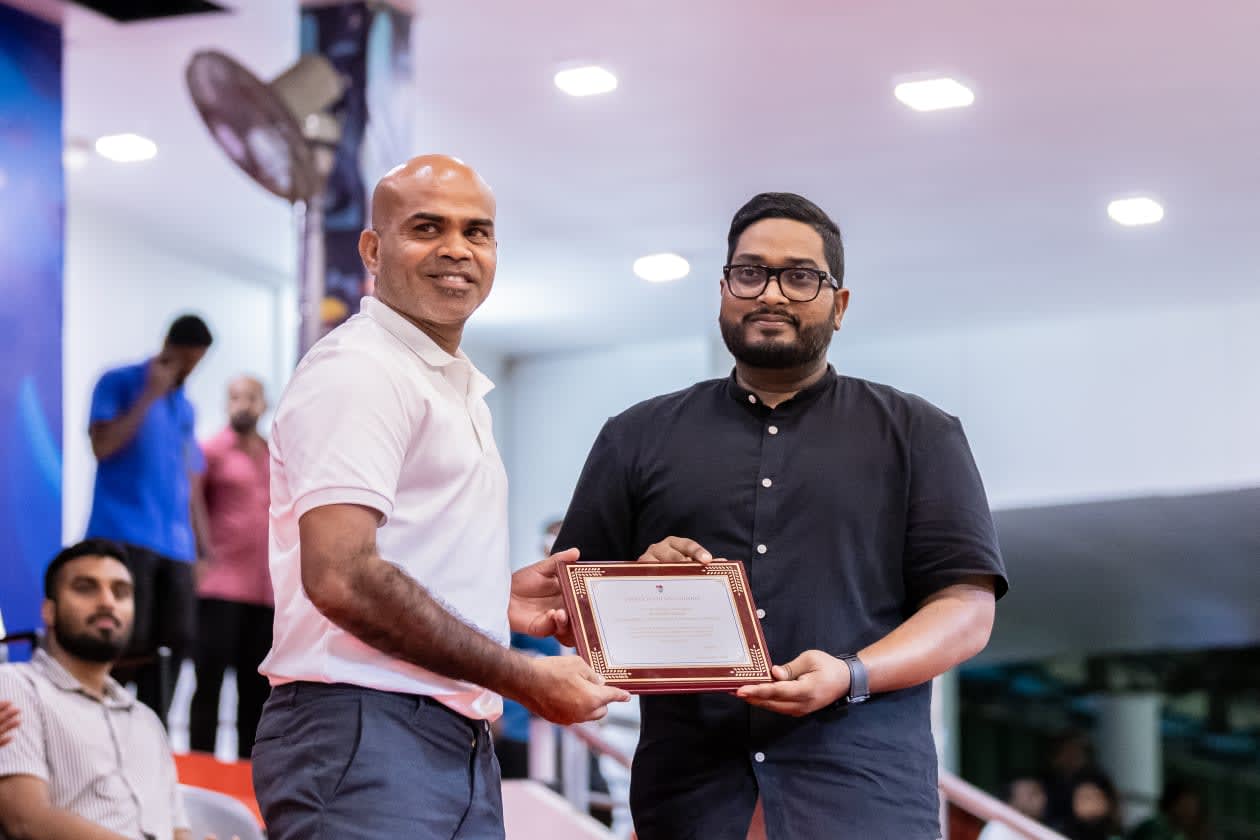 ޕްރޯ ލައިސަންސް ހާސިލްކުރި ކޯޗު ސުޒެއިން އަށް އެފްއޭއެމްގެ ރައީސް ބައްސާމް ހަނދާނީ ފިލާ ހަވާލުކުރަނީ.--- ފޮޓޯ: މުހައްމަދު ޝާބިން/ އަދަދު