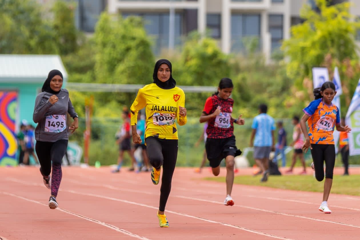 އިންޓަ ސްކޫލް އެތުލެޓިކްސް މުބާރާތުގެ 17 އަހަރުން ދަށުގެ އަންހެން ކުދިންގެ 100 މީޓަރު ދުވުމުގެ ފައިނަލް ހީޓުގައި ދުވެ އަހުނާ ރެކޯޑު ހަދަނީ - ފޮޓޯ: މުހައްމަދު ޝާބިން