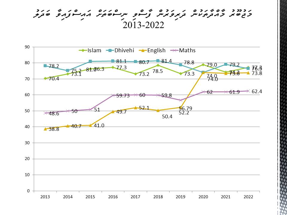 އެޑިއުކޭޝަން މިނިސްޓްރީން ހިއްސާކުރި ތަފާސްހިސާބުތަކުން އެނގޭ ގޮތުގައި ހިސާބުން 62 ޕަސެންޓު އަދި އިނގިރޭސިން 73 ޕަސެންޓު ކުދިން ވަނީ ފާސްވެފަ އެވެ. އެ އަދަދުތައް 2019 ގައި ހުރީ 52 އަދި 56 ޕަސެންޓުގަ އެވެ.