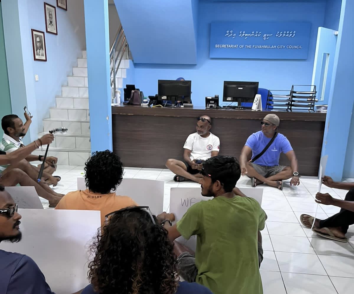 ފުވައްމުލަކު ޑައިވަރުން, ކައުންސިލުް އިދާރާގެ ރިސެޕްޝަން ސަރަހައްދު ބިމުގައި އިށީނދެ ތިބެ އިހުތިޖާޖު ކުރަނީ