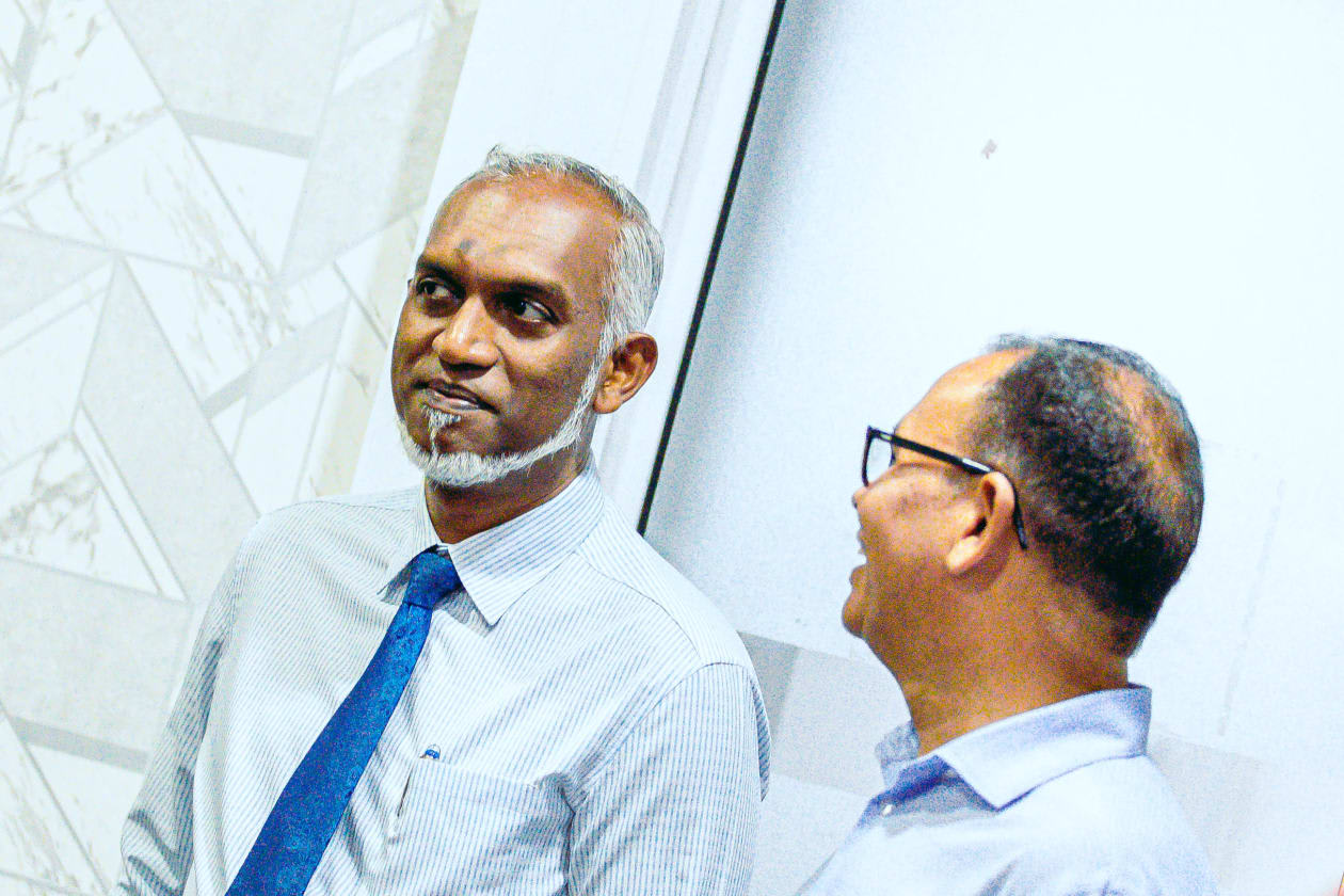 ޕީއެންސީގެ ރިޔާސީ ޓިކެޓަށް ވާދަ ކުރައްވާނެ ކަމަށް އިއުލާނު ކުރައްވާފައިވާ ކުރީގެ ޑިފެންސް މިނިސްޓަރު އާދަމް ޝަރީފު އާއި، ޔާމީނަށް ވާދަ ނުކުރެއްވޭ ހާލަތުގައި ޕީޕީއެމްގެ ރިޔާސީ ޓިކެޓު ހޯއްދެވުމަށް މަަސައްކަތް ކުރައްވާ މާލޭ މޭޔަރު ޑރ. މުހައްމަދު މުއިއްޒު، މިއަދު ޕީޕީއެމްގެ އޮފީހުގައި. -- ފޮޓޯ: މިރާޝް ނާޝިމް/ އަދަދު