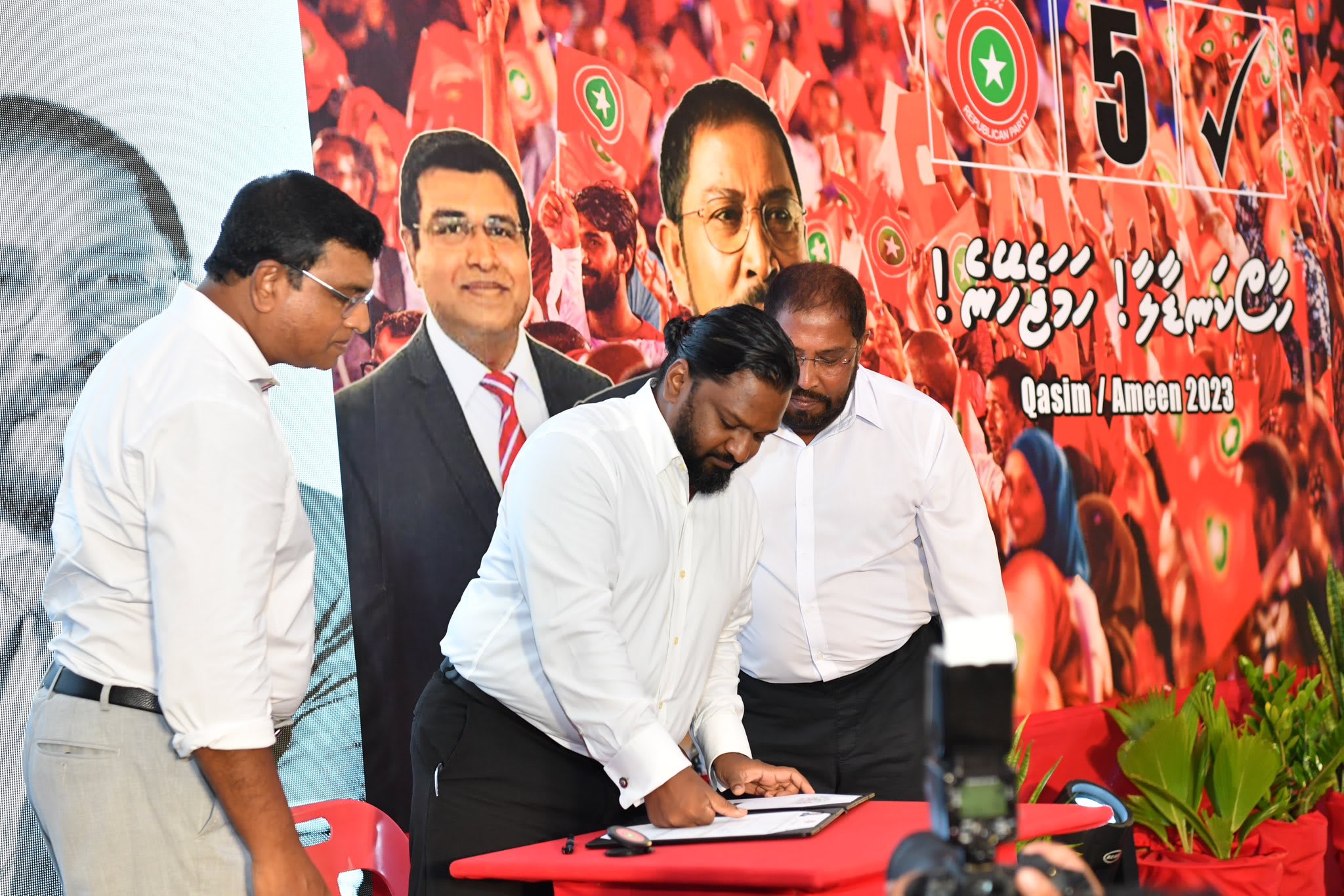They signed to JP during a rally held in Maamigili island on Saturday night. Maamigili is the home island of JP leader and presidential candidate Qasim Ibrahim.