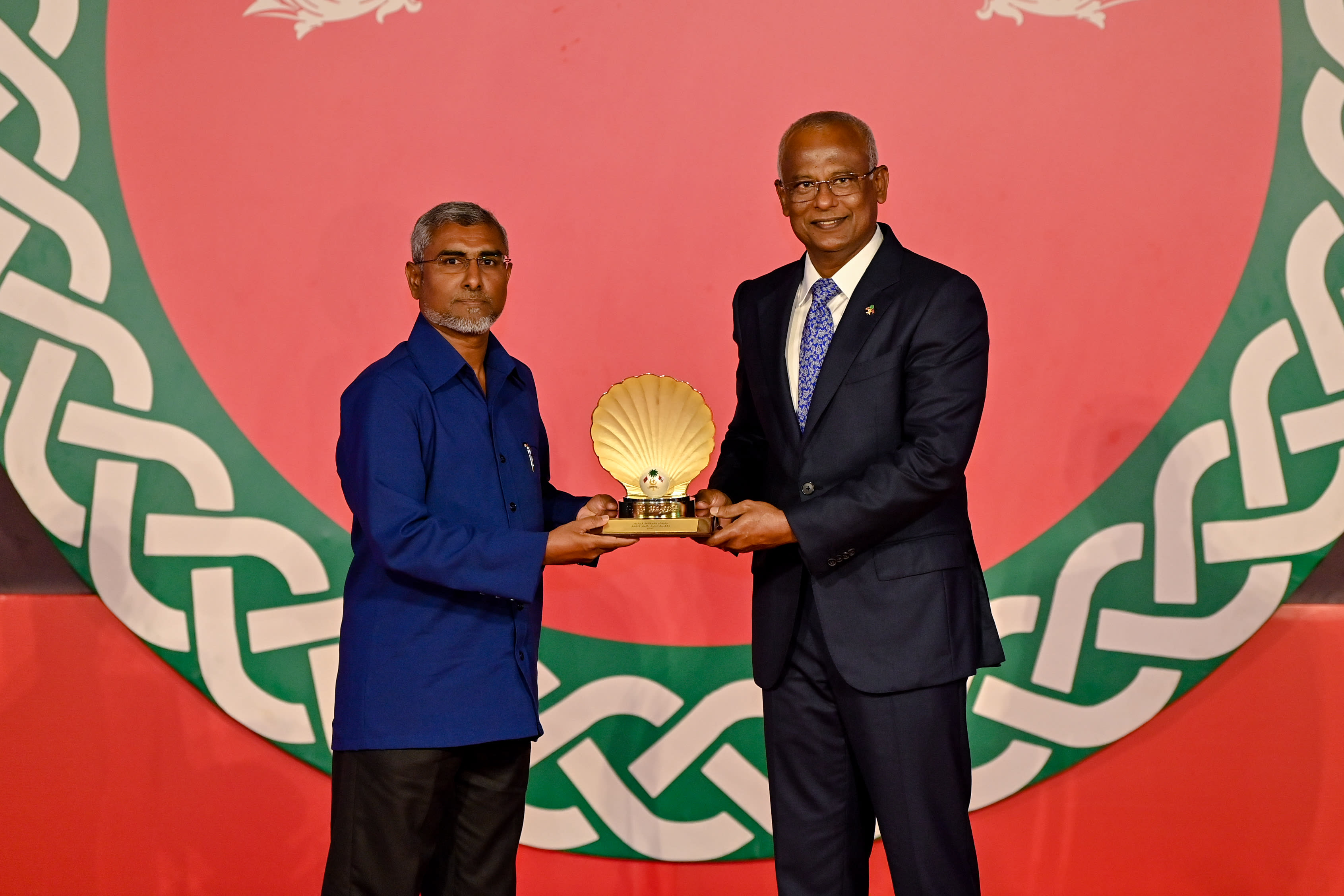 ޝާކިރު (ވ) އަށް ރައީސް އިބްރާހީމް މުހައްމަދު ސޯލިހު މިދިޔަ އަހަރު ޝަރަފްވެރިކަމުގެ ގައުމީ އިނާމު ދެއްވަނީ. --ފޮޓޯ: ރައީސް އޮފީސް