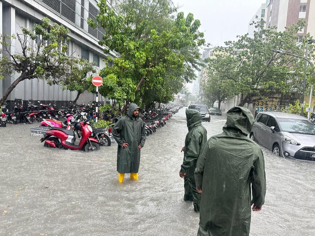 އިއްޔެ މާލޭގައި ފެންބޮޑުވުމާއެކު ފެން ހިންދުމުގެ މަސައްކަތް ސިފައިން ކުރަނީ. -- ފޮޓޯ: އެމްއެންޑީއެފް