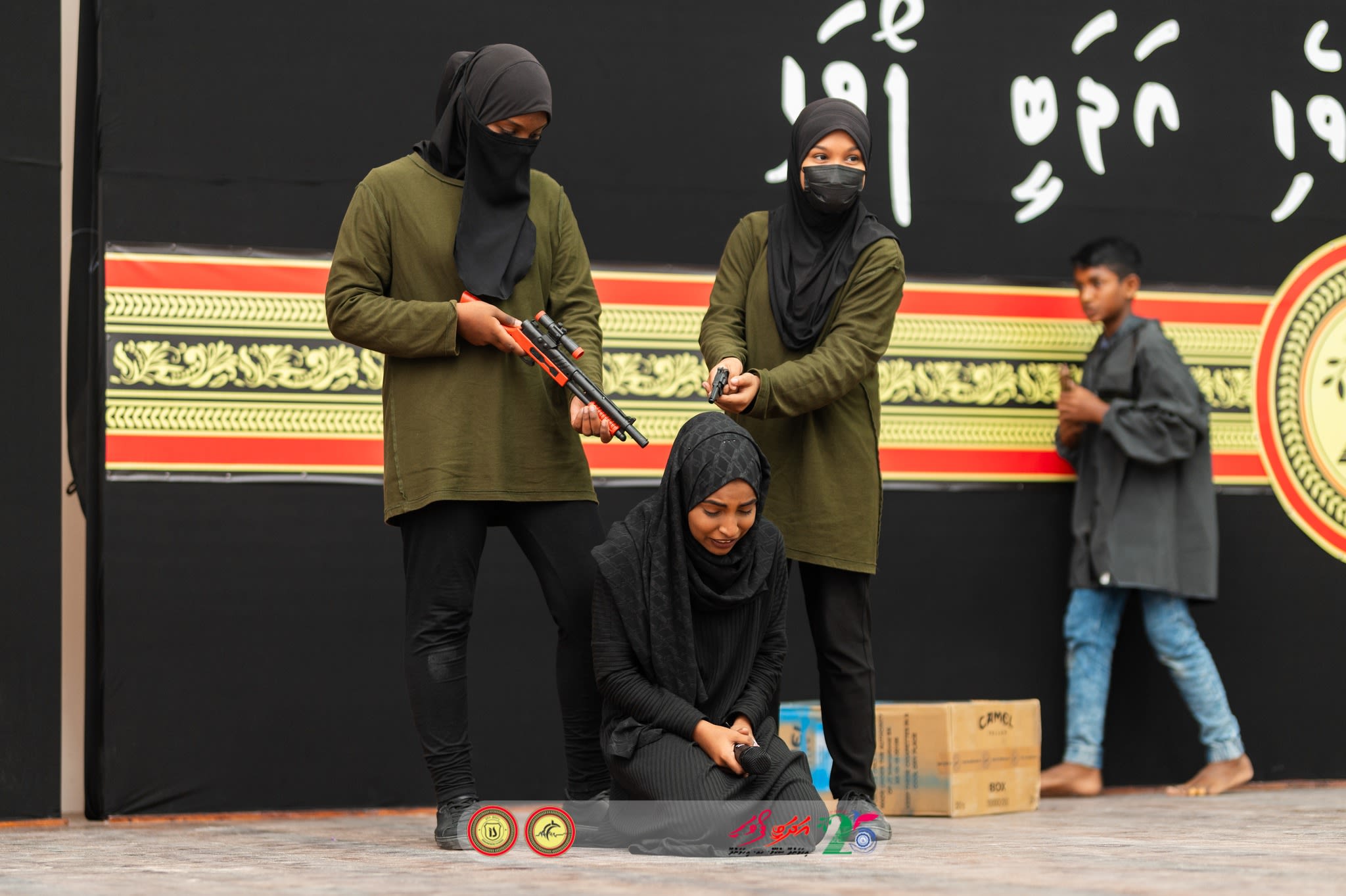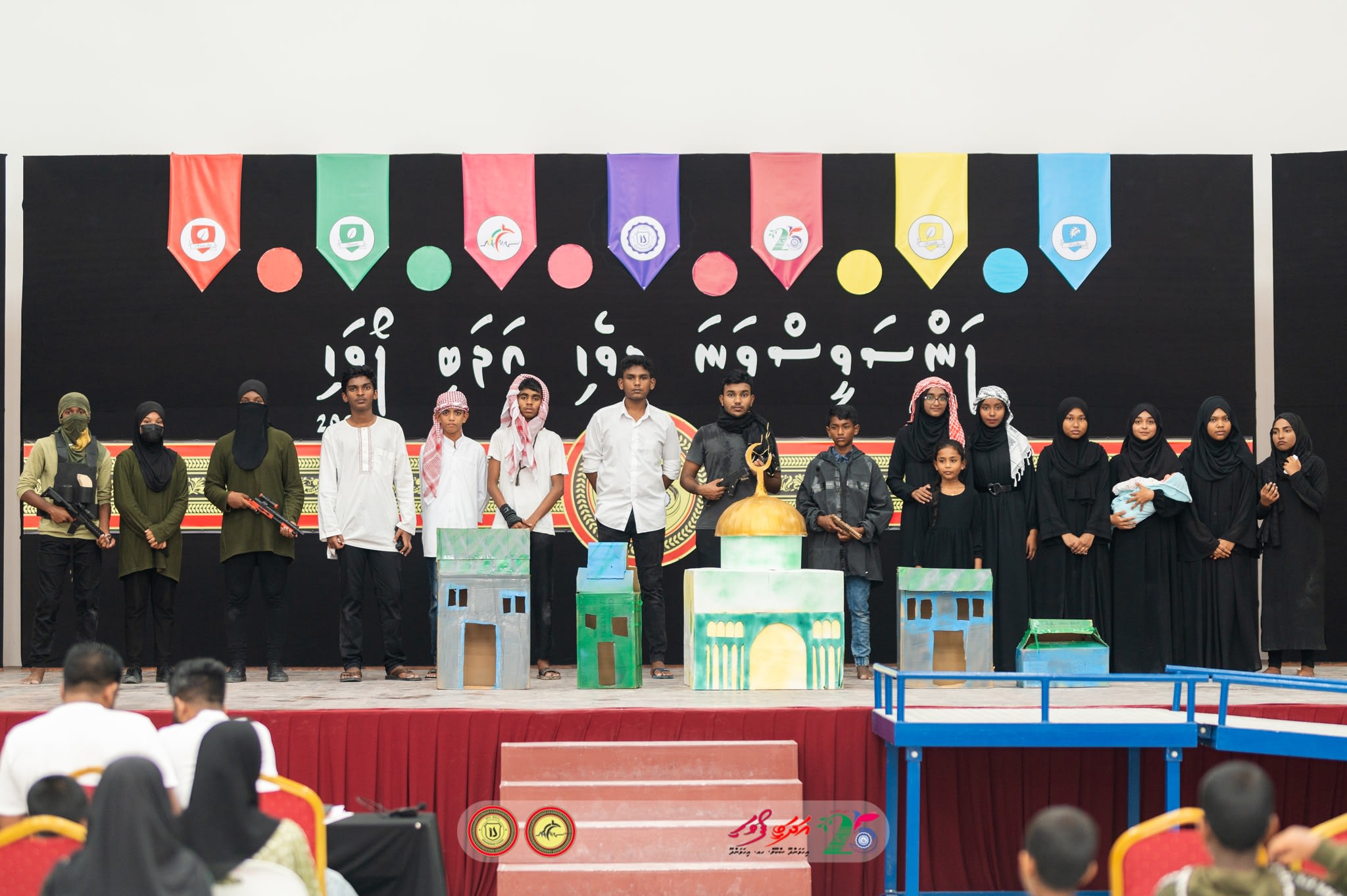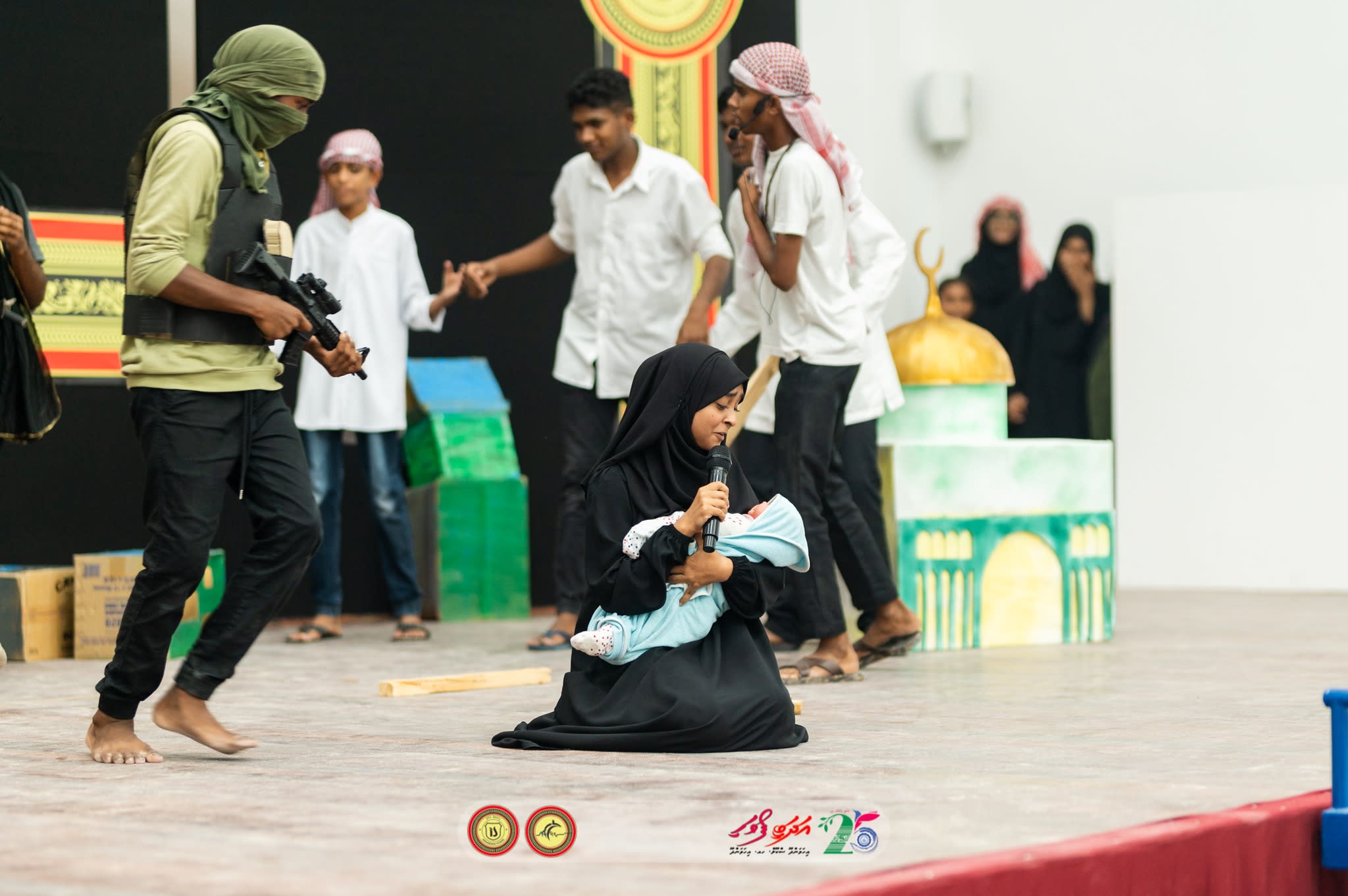 އިޒްރޭލުގެ ނުބައިކަމާއި ފަލަސްތީނުގެ ރައްޔިތުންގެ ހާލަތު ދައްކުވައިދޭން އިހަވަންދޫ ސްކޫލުގެ ދަރިވަރުން، އެ ސްކޫލުގެ އަދަބީ ފޯވަހީގައި ހުށަހަޅައިދިން ތަމްސީލެއް. -- ފޮޓޯ: ކަލަޑްރޮޕް