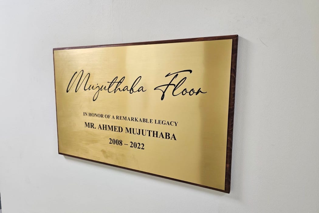 މަރުހޫމް އަހުމަދު މުޖުތަބާގެ ނަމުން ފިނޭންސް މިނިސްޓަރީގެ ފުރަތަމަ ފަންގިފިލާއަށް ނަން ބޯޑް ހަރުކޮށްފައި. -- ފޮޓޯ: ފިނޭންސް މިނިސްޓްރީ