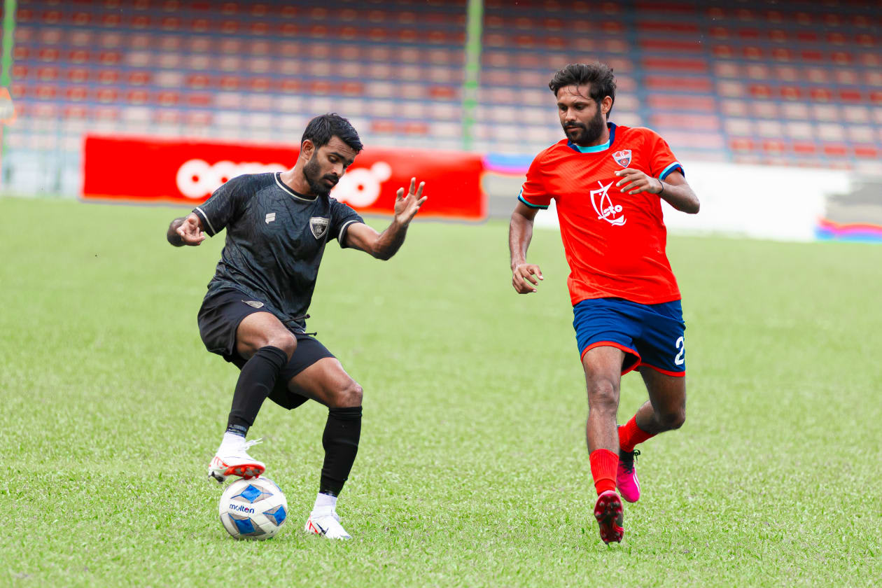 ޓީސީ ކޮޅަށް ގޯލު ޖެހުމަށްފަހު ކުލަބު އީގަލްސް ގެ އިބްރާހިމް މަހުދީ އާއި އަހުމަދު ރިޒުވާން އުފާފާޅުކުރަނީ - ފޮޓޯ: އަބްދުﷲ އިޔާން/އަދަދު