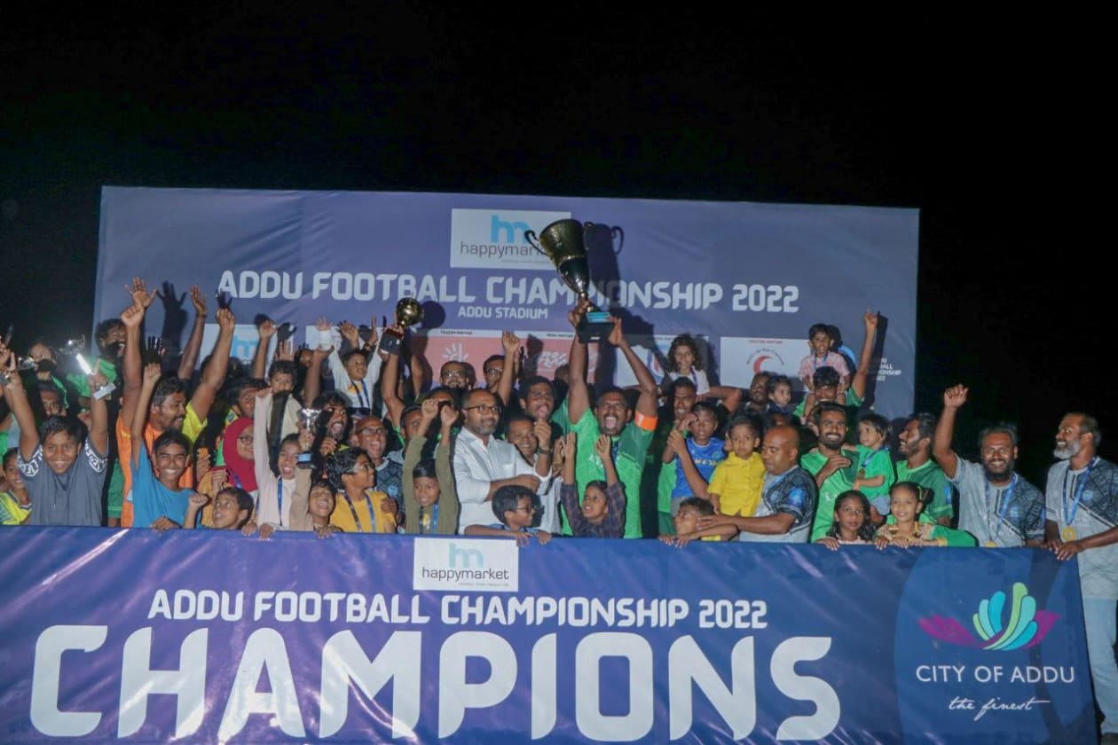 އައްޑޫ ފުޓްބޯލް ޗެމްޕިއަންޝިޕްގެ ޗެމްޕިއަންކަން ފޭދޫން ހޯދުމުން ބޭއްވި އުފާފާޅުކުރުމުގެ ތެރެއިން: ބެންޖޯ މުބާރާތުގެ ތަށި އުފުލާލަނީ.