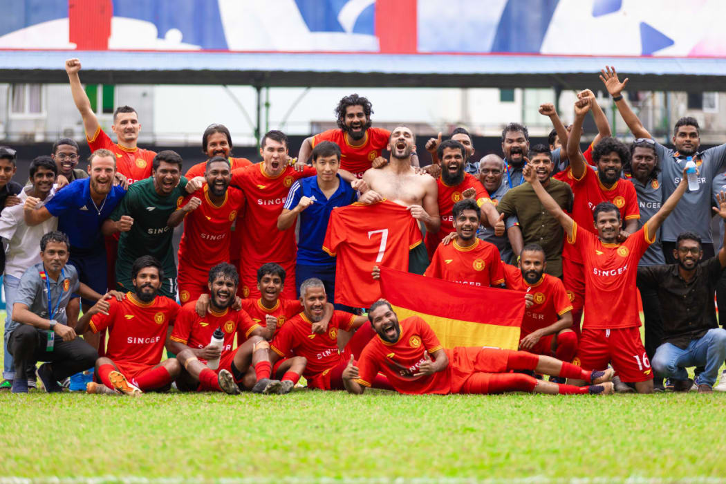 ވިކްޓަރީ ޓީމުގެ އޮފިޝަލުންނާއި ކުޅުންތެރިންނާ އެކު އައްސަދު ފޮޓޯގައި.--- ފޮޓޯ: އަބްދުﷲ އިޔާން / އަދަދު