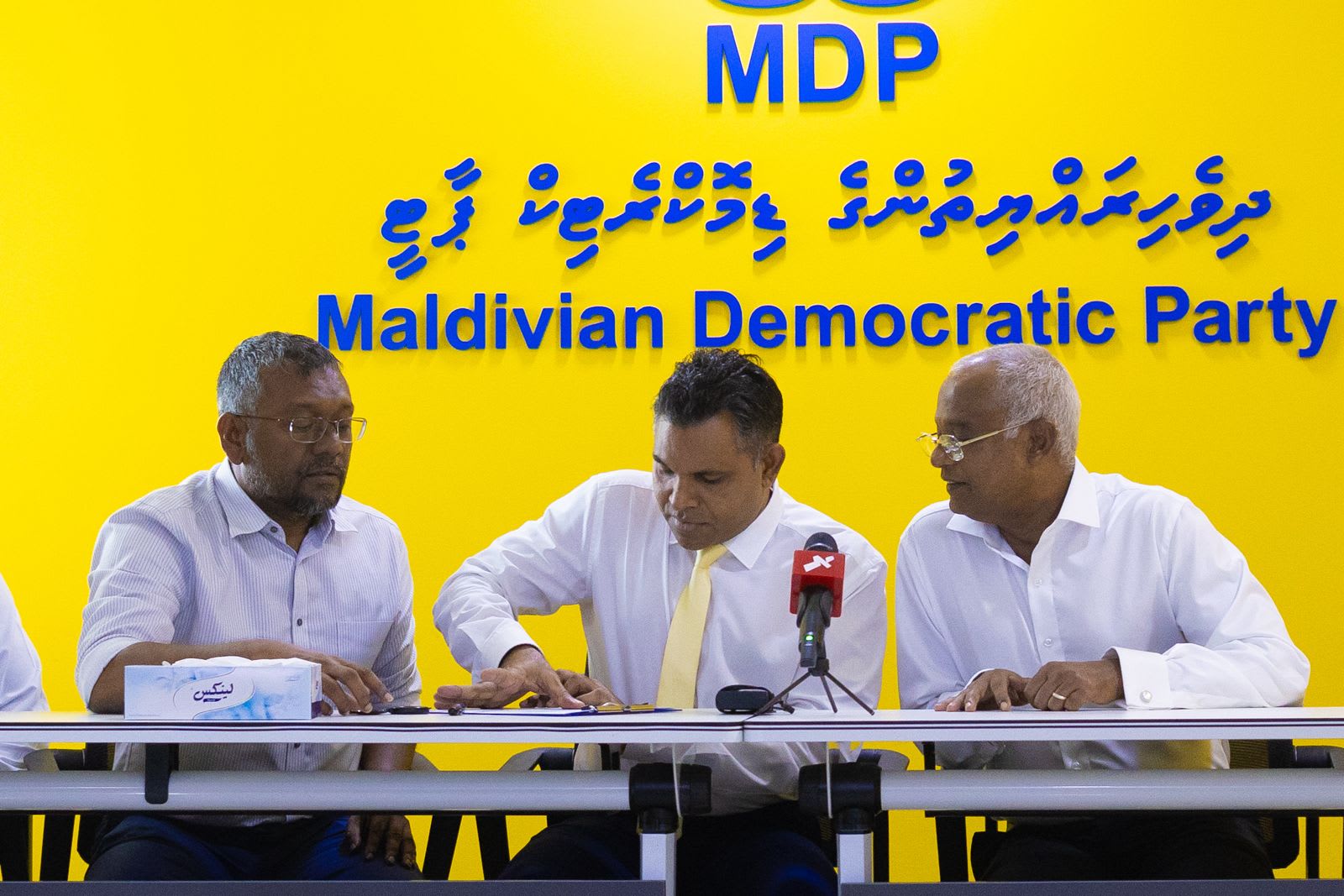 އެމްޑީޕީގެ އޮފީހުގައި މިއަދު އެ ޕާޓީއަށް ސޮއިކުރެއްވުމަށް ފަހު ފައިސަލްގެ ފޯމާ ހަވާލުވީ ކުރީގެ ރައީސް އިބްރާހިމް މުހައްމަދު ސޯލިހު އެވެ. އެ ބޭފުޅުންގެ އަރިހުގައި އެމްޑީޕީގެ ޗެއާޕާސަން ފައްޔާޒު އިސްމާއީލް އަދި އެ ޕާޓީގެ ރައީސް އަބްދުالله ޝާހިދު ވެއް ތިއްބެވި އެވެ.