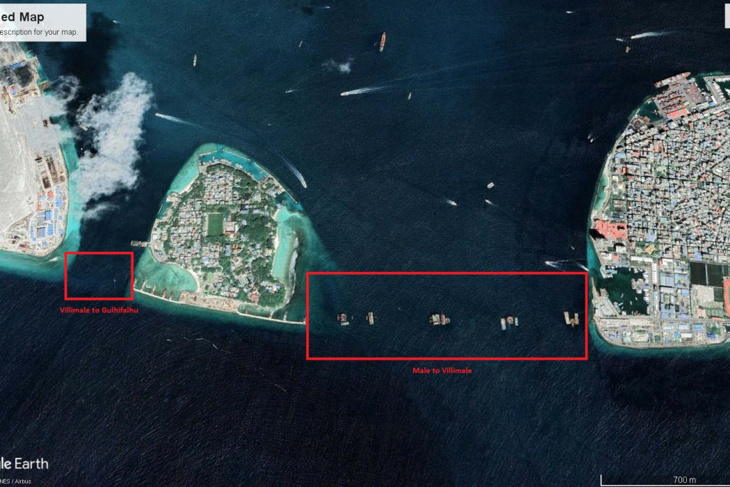 މާލެ-ވިލިމާލެ އަދި ވިލިމާލެ-ގުޅީފަޅު ކަނޑުއޮޅި; ބްރިޖުގެ މަސައްކަތް ކުރިއަށް ދާތީ އެ ކަނޑުއޮޅި ބޭނުން ނުކުރަން ތަކުރާރުކޮށް އެދިފައިވޭ -- ފޮޓޯ: ކޮންސްޓްރަކްޝަން މިނިސްޓްރީ