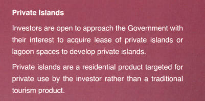 “Investors are open to approach the government with their interest to acquire lease of private islands or lagoon spaces to develop private islands,” read the information written in English.