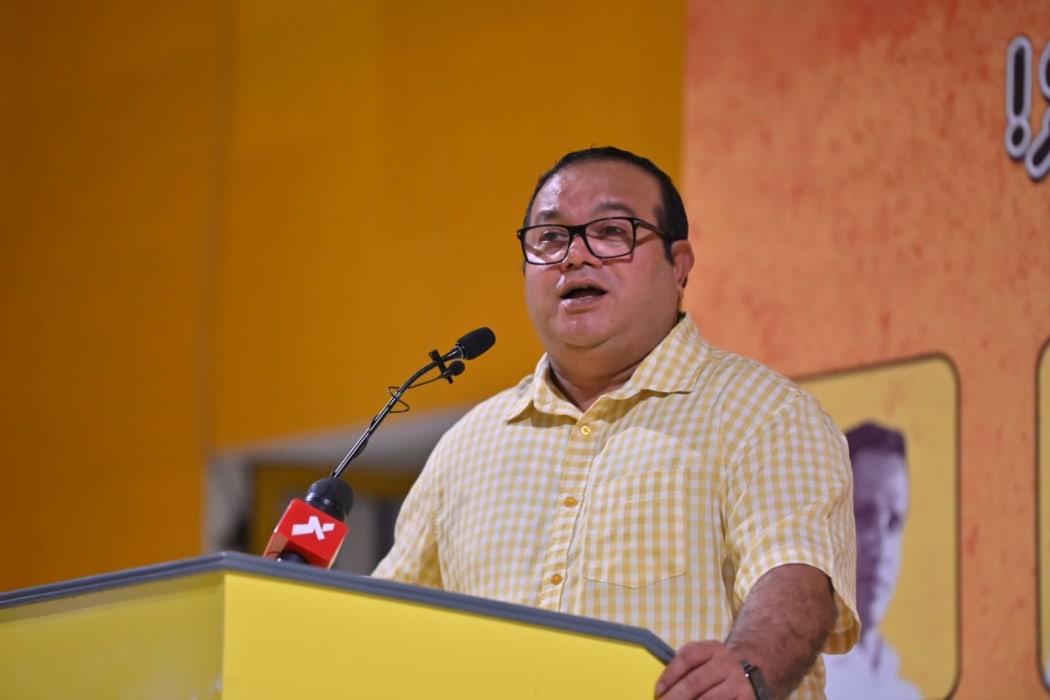 އައްޑޫ ސިޓީގެ ހިތަދޫގައި ރޭ އެމްޑީޕީއިން ބޭއްވި ކެމްޕޭނު ޖަލްސާގައި ރައްޔިތުންގެ މަޖިލީހުގެ ރައީސް މުހައްމަދު އަސްލަމް ވާހަކަ ދައްކަވަނީ. -- ފޮޓޯ: އެމްޑީޕީ