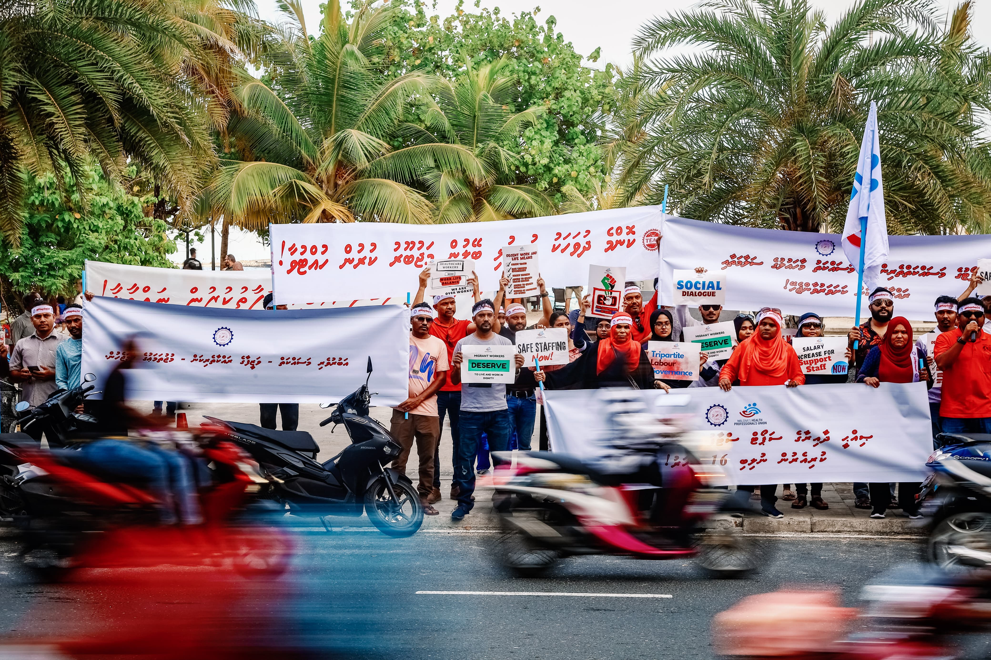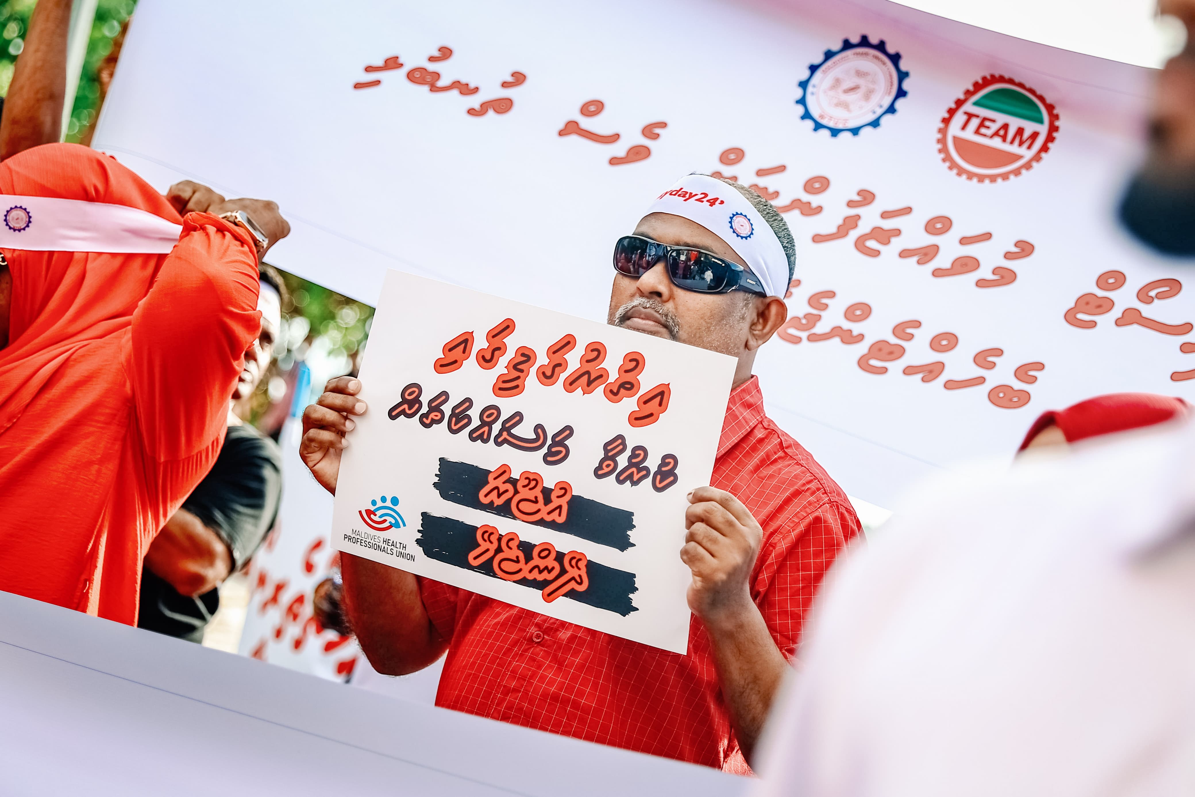މަސައްކަތްތެރިންގެ ދުވަސް (މޭ ޑޭ) ގެ މުނާސަބަތުގައި ކުރިއަށްދާ ރެލީގައި މަސައްކަތްތެރިން ހައްގުތަކަށް އަޑު އުފުލަނީ - ފޮޓޯ: މިރާން ނާޝިމް / އަދަދު
