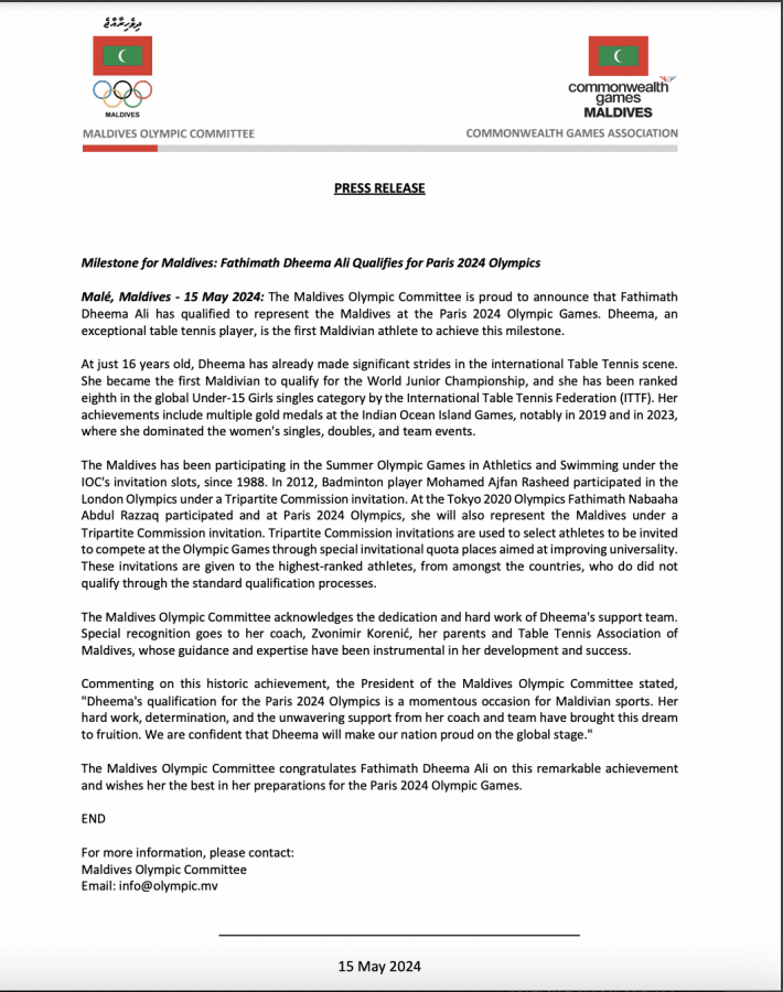 "މީގެ ކުރިން ރާއްޖެއިން އޮލިމްޕިކްސްގައި އެތުލީޓުން ވާދަކޮށްފައިވަނީ ޔުނިވާސާލިޓީ ޕްލޭސްގައި އެއީީ ސްވިމިންގް އާއި އެތުލެޓިކްސްގެ އެތުލީޓުން ދެން މި މި ލިބެނީ, ޓްރައިޕާޓޭ އިންވިޓޭޝަން, އެ ގޮތަށް ވެސް އެތުލީޓުން ވަނީ އޮލިމްޕިކްސްގައި ވާދަކޮށްފައި, މި އަހަރުގެ އޮލިމްޕިކްސްގައި ވެސް އެ ގޮތަށް ކުޅުންތެރިން ބައިވެރިވާނެ." ތަމޫހު ވިދާޅުވި އެވެ.