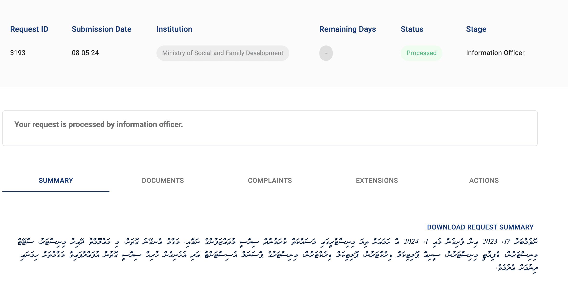 މައުލޫމާތު ހޯދައި ލިބިގަތުމުގެ ހައްގުގެ ގާނޫނުގެ ދަށުން "އަދަދު" ނޫހުން ވަނީ ނޮވެމްބަރު 17 2023 އިން މެއި 1, 2024 އާ ހަމައަށް އެ މިނިސްޓްރީގައި ތިބި ސިޔާސީ މުވައްޒަފުންގެ މައުލޫމާތު ހޯދުމަށް އެދިފަ އެވެ.