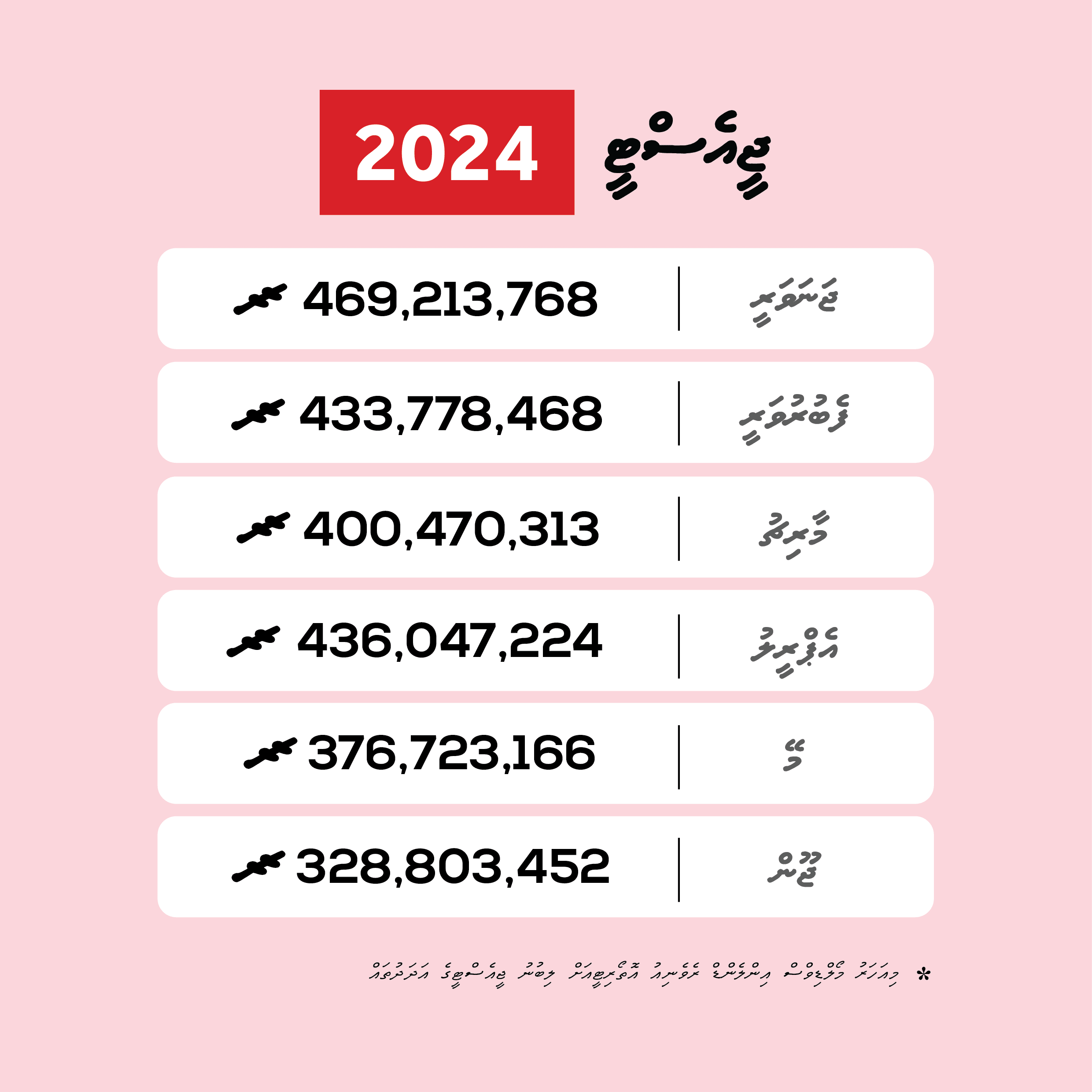 މިދިޔަ އަހަރު އެވްރެޖުކޮށް މަހެއްގެ މައްޗަށް، 370 މިލިއަން ރުފިޔާ ޖީއެސްޓީގެ ގޮތުގައި ދައުލަތަށް ލިބުނުއިރު، މި އަހަރުގެ ފުރަތަމަ ހަ މަސް ދުވަހު އެވްރެޖުކޮށް މަހަކު 407 މިލިއަން ރުފިޔާ ޖީއެސްޓީގެ ގޮތުގައި ލިބިފައިވެ އެވެ.