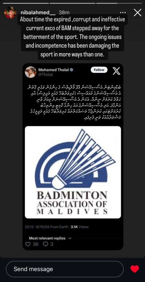 ނިބާލް ލިޔުނު ޕޯސްޓެއްގައި ބުނެފައިވަނީ، ބެޑްމިންޓަން އެސޯސިއޭޝަންގެ އެންމެ ފަހުން އޮތް، މުއްދަތު ހަމަވެފައިވާ ކޮރަޕްޓް، ހިންގާ ކޮމިޓީ މަގާމުން ދުރަށް ދިއުމަކީ މިހާރުން މިހާރަށް ކުރަން ޖެހޭ ކަމެއް ކަމަށެވެ. އެއީ، ބެޑްމިންޓަނުގެ ރަނގަޅަކަށް ކުރަން ޖެހޭ ކަމެއް ކަމަށާއި މިހާރު ރާއްޖޭގެ ބެޑްމިންޓަންގެ ހާލަތު ވެއްޓިފައި ހިސާބަށް ބަލާއިރު، އެ ކުޅިވަރަށް އެންމެ ބޮޑު ގެއްލުމެއް ދިނީ، އެސޯސިއޭޝަންގެ އެ ހިންގާ ކޮމިޓީން ކަމަށް ނިބާލް ވަނީ ބުނެފަ އެވެ.