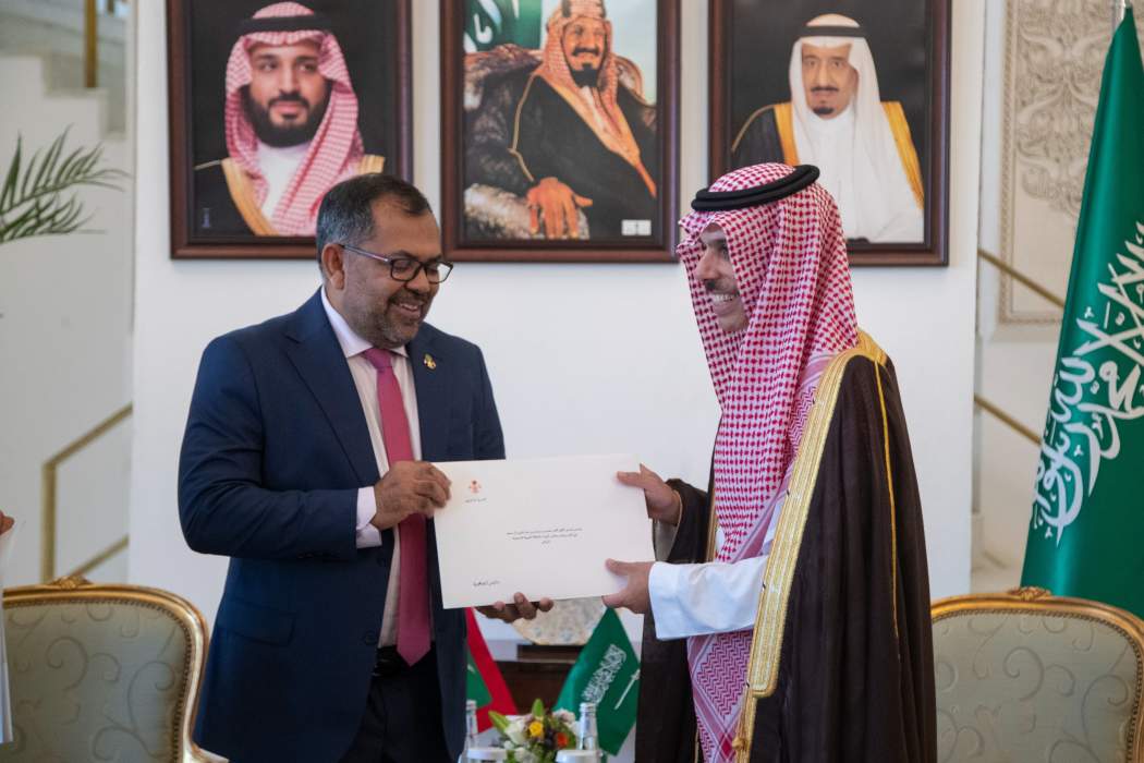 ޮފޮރިން މިނިސްޓަރު ޒަމީރު ސައުދީ ހާރިޖީ ވަޒީރު ވަލީއަހުދު ފައިސަލްއާ ރައީސްގެ ސިޓީ ހަވާލުކުރައްވަނީ: ރައީސްގެ ސިޓީއަކީ ސައުދީ ވަލީއަހުދު އަދި ބޮޑު ވަޒީރު މުހައްމަދު ބިން ސަލްމާނަށް އެޑްރެސްކުރައްވާ ފޮނުއްވި ސިޓީއެއް -- ފޮޓޯ: ފޮރިން މިނިސްޓްރީ