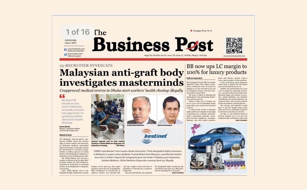 ޖުލައި 2022, ގައި މެލޭޝިއާގެ އެންޓި ކޮރަޕްޝަން ކޮމިޝަނުން ބެސްޓިނެޓުގެ އޮފީސް ރެއިޑުވެސް ކުރި އެވެ. އެއީ ބަންގަލަދޭޝް މަސައްކަތްތެރިން ގެނައުމަށް 25 އެޖެންސީ ނެގުމުގައި ކޮރަޕްޝަނާއި ބާރުގެ ބޭނުން ނަހަމަ ގޮތުގައި ހިމެނޭ ކަމަށް ތުހުމަތު ކޮށެވެ.