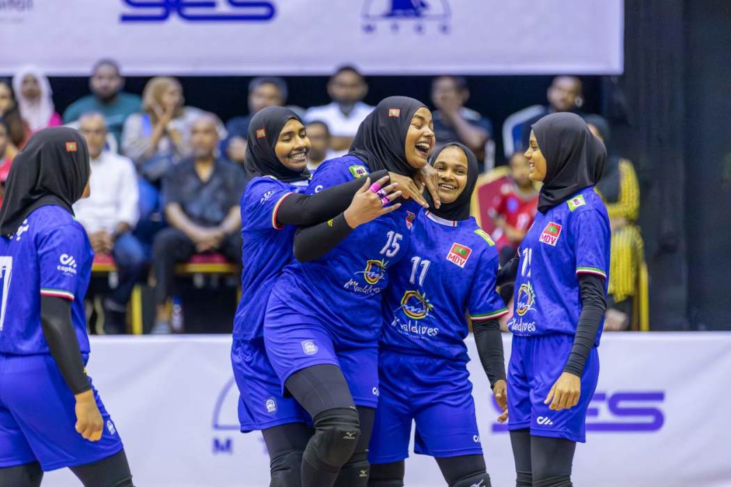 ތަޖިކިސްތާނާ ދެކޮޅަށް ކުޅުނު މެޗުގެ ތެރެއިން ގައުމީ އަންހެން ވޮލީ ޓީމުގެ ކުޅުންތެރިން އުފާފާޅުކުރަނީ.--- ފޮޓޯ: އަތޫފް އާތިފް/ އަދަދު ސްޕޯޓްސް