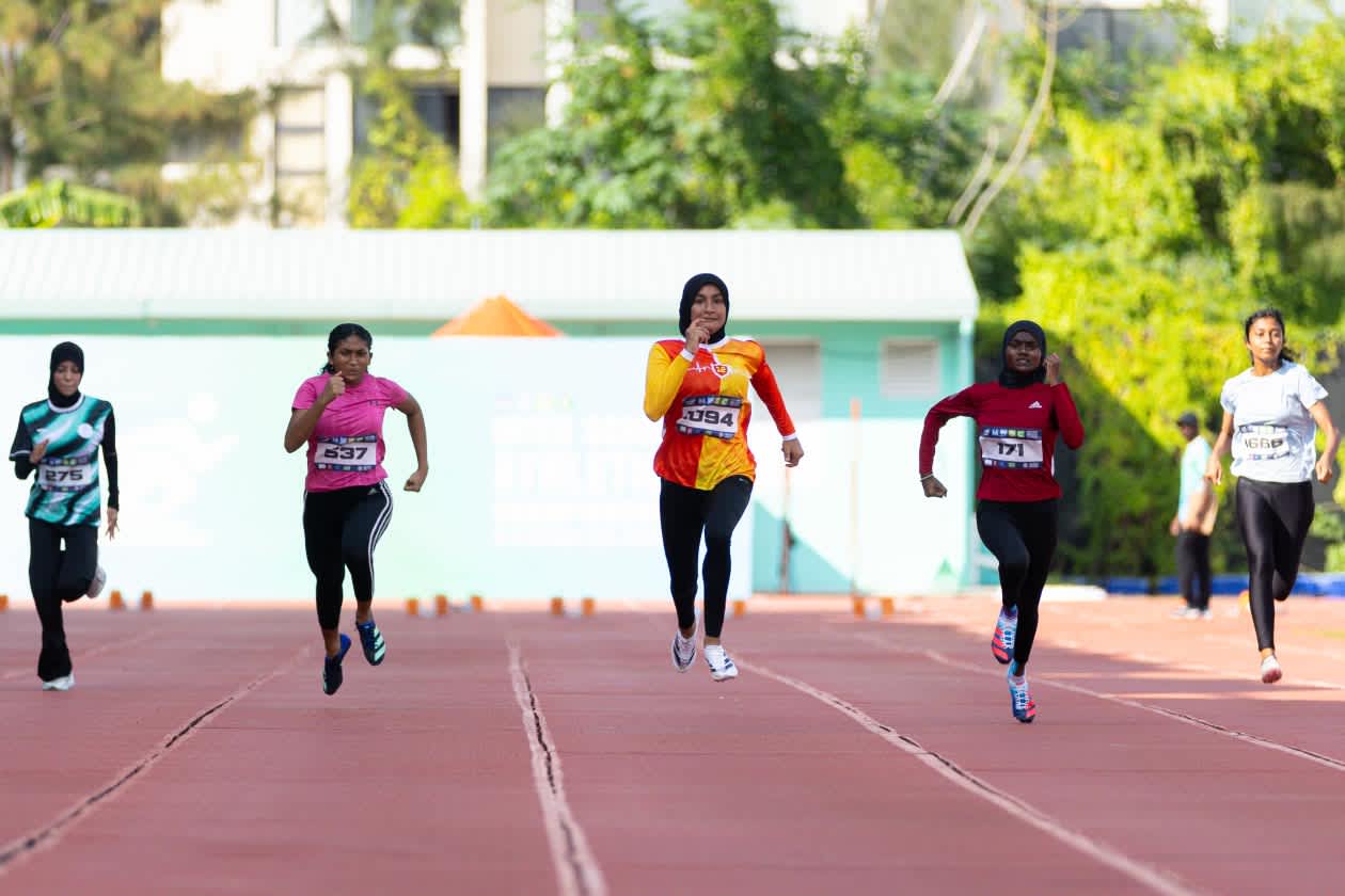 އަންހެން 100 މީޓަރު ދުވުމުގެ ފައިނަލް ހީޓުގައި އެތުލީޓުން ދުވަނީ - ފޮޓޯ: އަތޫފް އާތިފް / އަދަދު