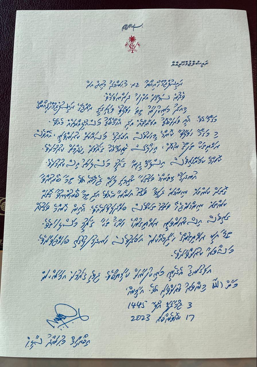 ކުރީގެ ރައީސް އިބްރާހިމް މުހައްމަދު ސޯލިހު އަދި އެ މަނިކުފާނު ރައީށް މުއިއްޒަށް ފޮނުއްވި ސިޓީ