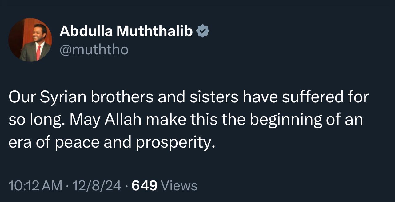ހަނގުރާމަވެރި ޖަމާއަތްތަކުން ސީރިޔާގެ ވެރިރަށް ދިމިޝްކު ހިފައި، އެ ގައުމުގެ ދުވަސްވީ ހުދުމުހުތާރު ވެރިކަން ނިމުމަކަށް ގެނައުމާއެކު އެކަމަށް ތާއީދުކޮށް ކޮންސްޓްރަކްޝަން އެންޑް އިންފްރާސްޓަކްޗާ މިނިސްޓަރު އަބްދުﷲ މުއްތަލިބު މިއަދު ކުރެއްވި ޕޯސްޓު ޑިލީޓު ކުރައްވައިފި އެވެ.
