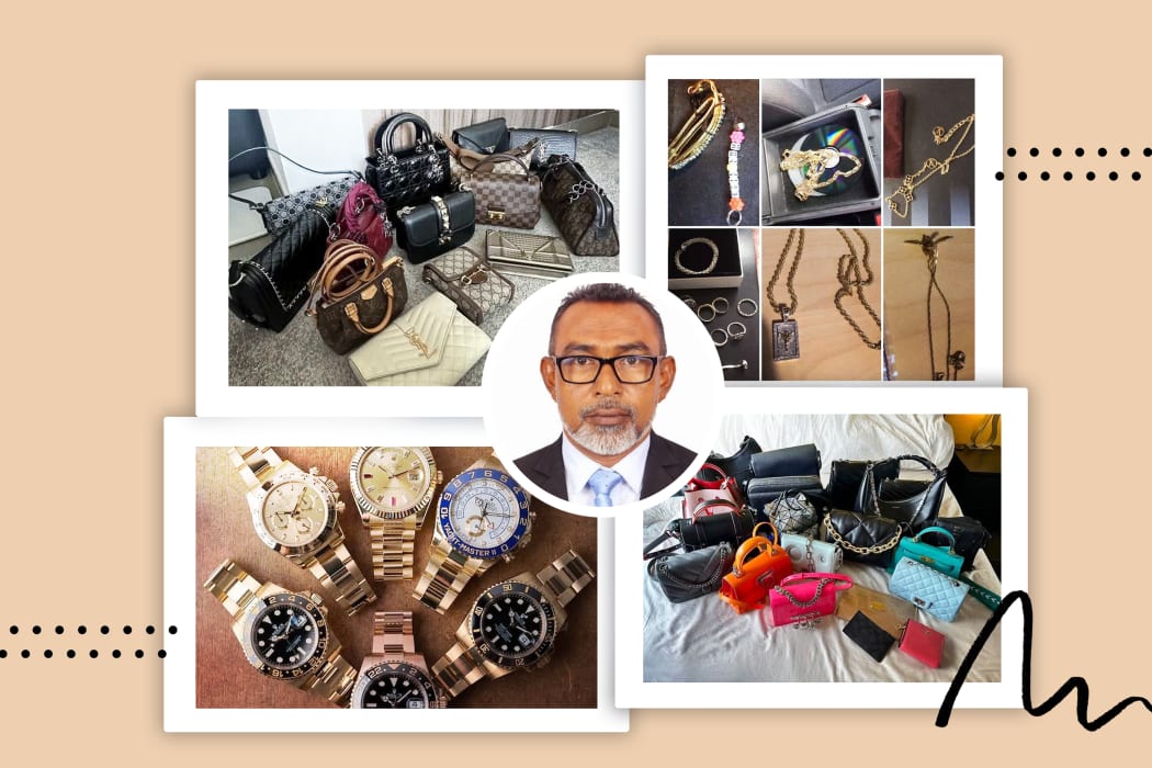 ދައުރުކުރާ ފޮޓޯތަކުގައި ހިމެނެނީ އަގުބޮޑު އަތުކުރީ ގަޑިތަކަކާއި ގަހަނާތަކެއްގެ އިތުރުން، ބްރޭންޑެޑް އަތް ދަބަސް ތަކެކެވެ. މިއީ މޫކޭގެ ގެއިން ފެނުނު ތަކެތި ކަމަށާއި މި ތަކެއްޗަކީ އާރުޑީސީގެ ލާރިއަށް ގަނެފައިވާ ތަކެތި ކަމަށް މި ޕޯސްޓުތަކުގައި ބުނެފައިވެ އެވެ. އެ ތަކެތީގެ އަގު ހަ މިލިއަނަށް އަރާ ކަމަށްވެސް ބައެއް ޕޯސްތަކުގައި ބުނެފައިވެ އެވެ.